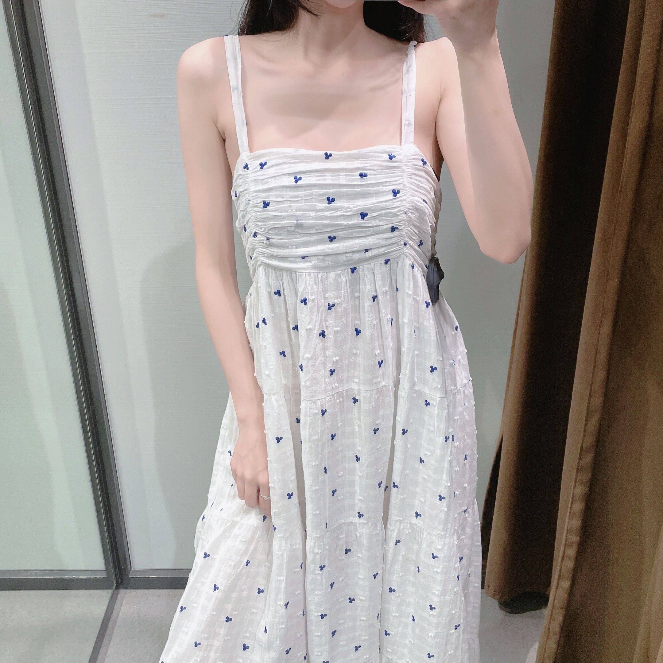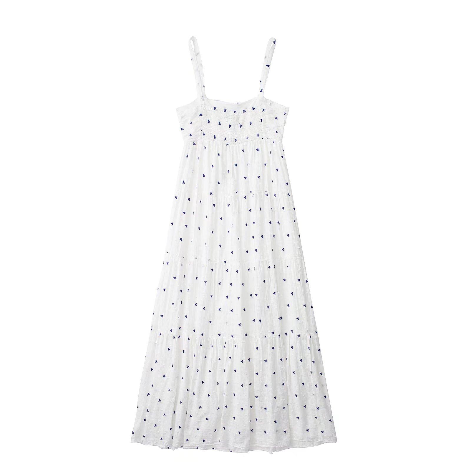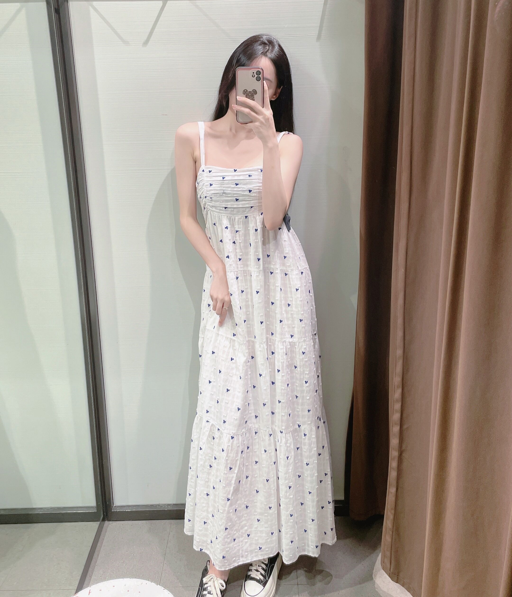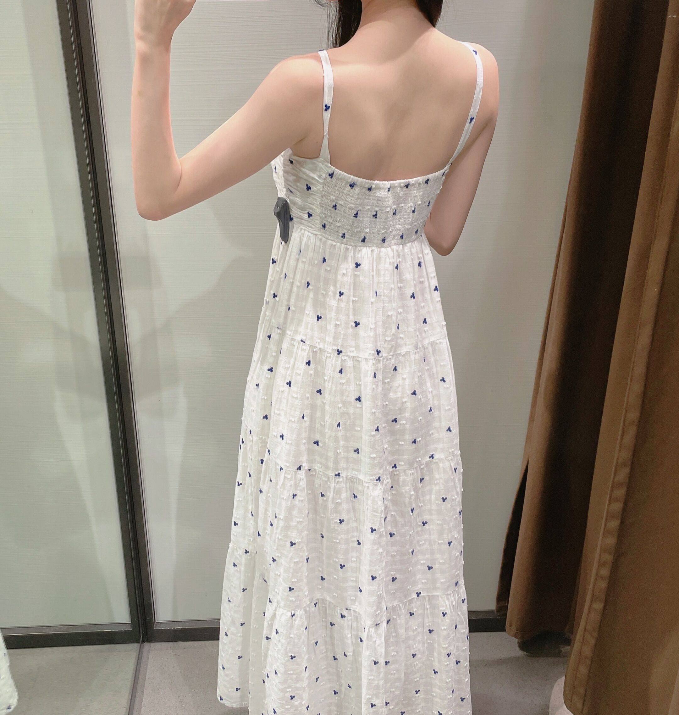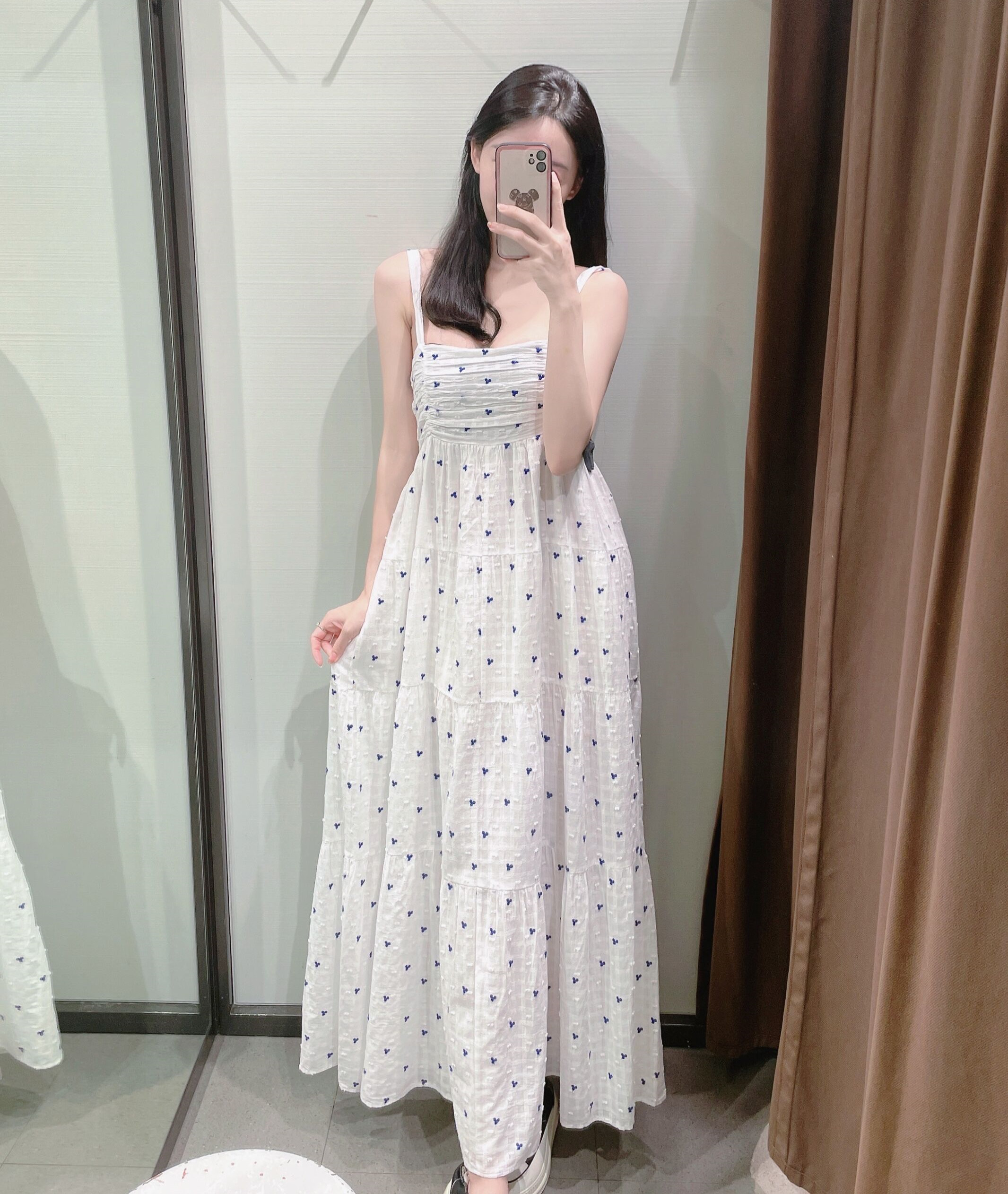 全体に散りばめられた小さな花柄が上品で優雅な雰囲気を醸し出し、足元まで流れるような長い丈感が縦のラインを強調してスタイルアップ効果も抜群です。