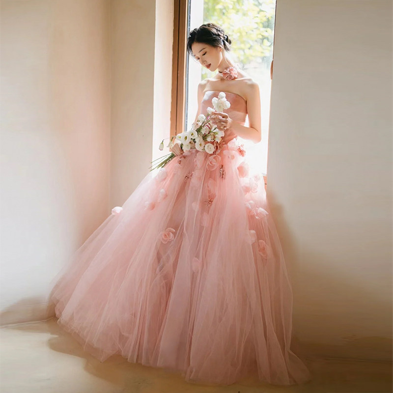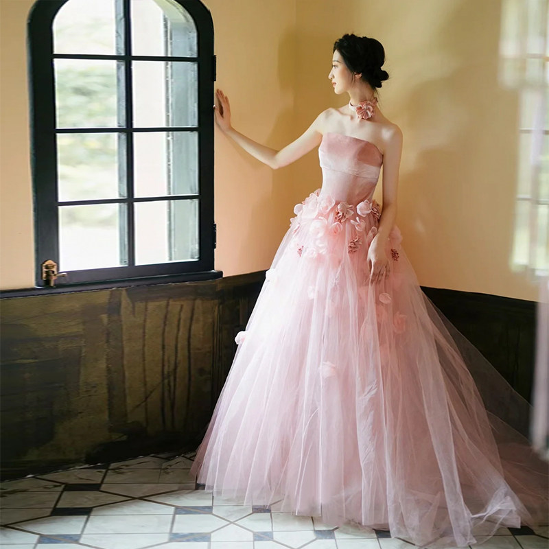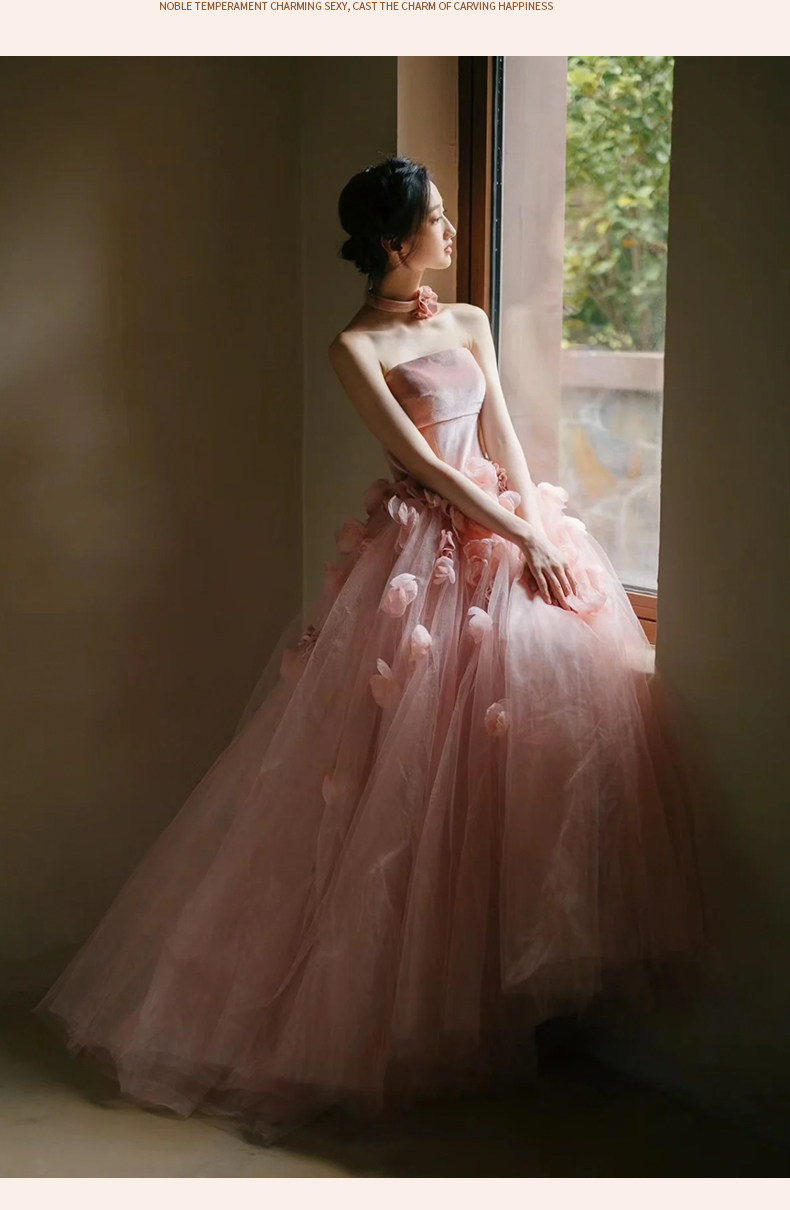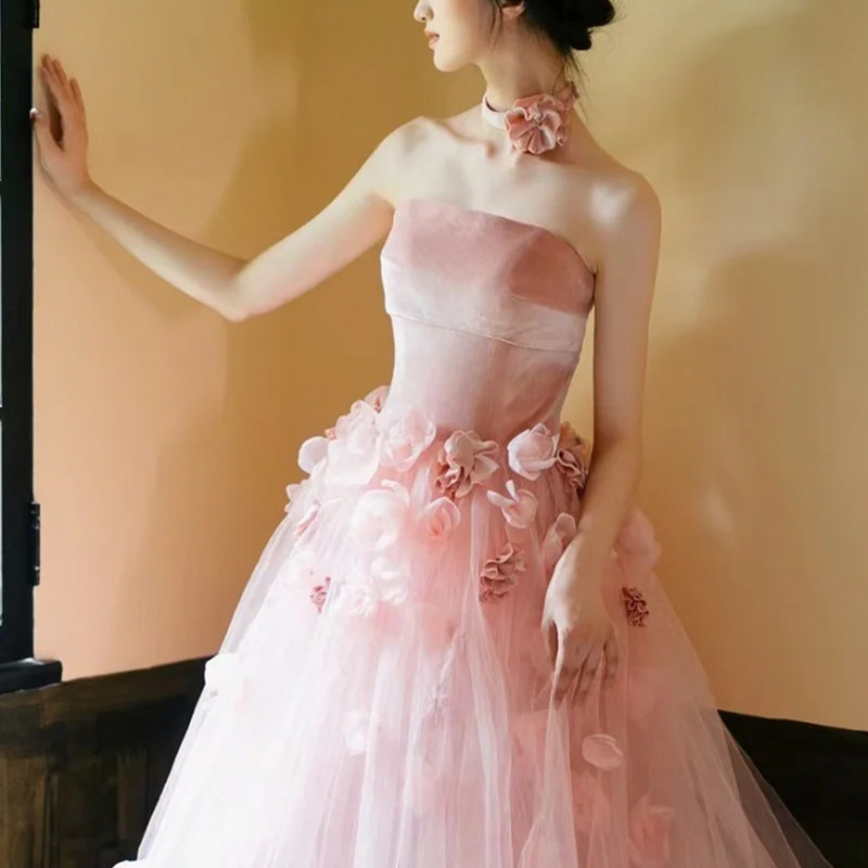 ベアトップデザインとネックレス風の花飾りが首元を美しく見せ、特別な日の女装スタイルを一層華やかに引き立てます。