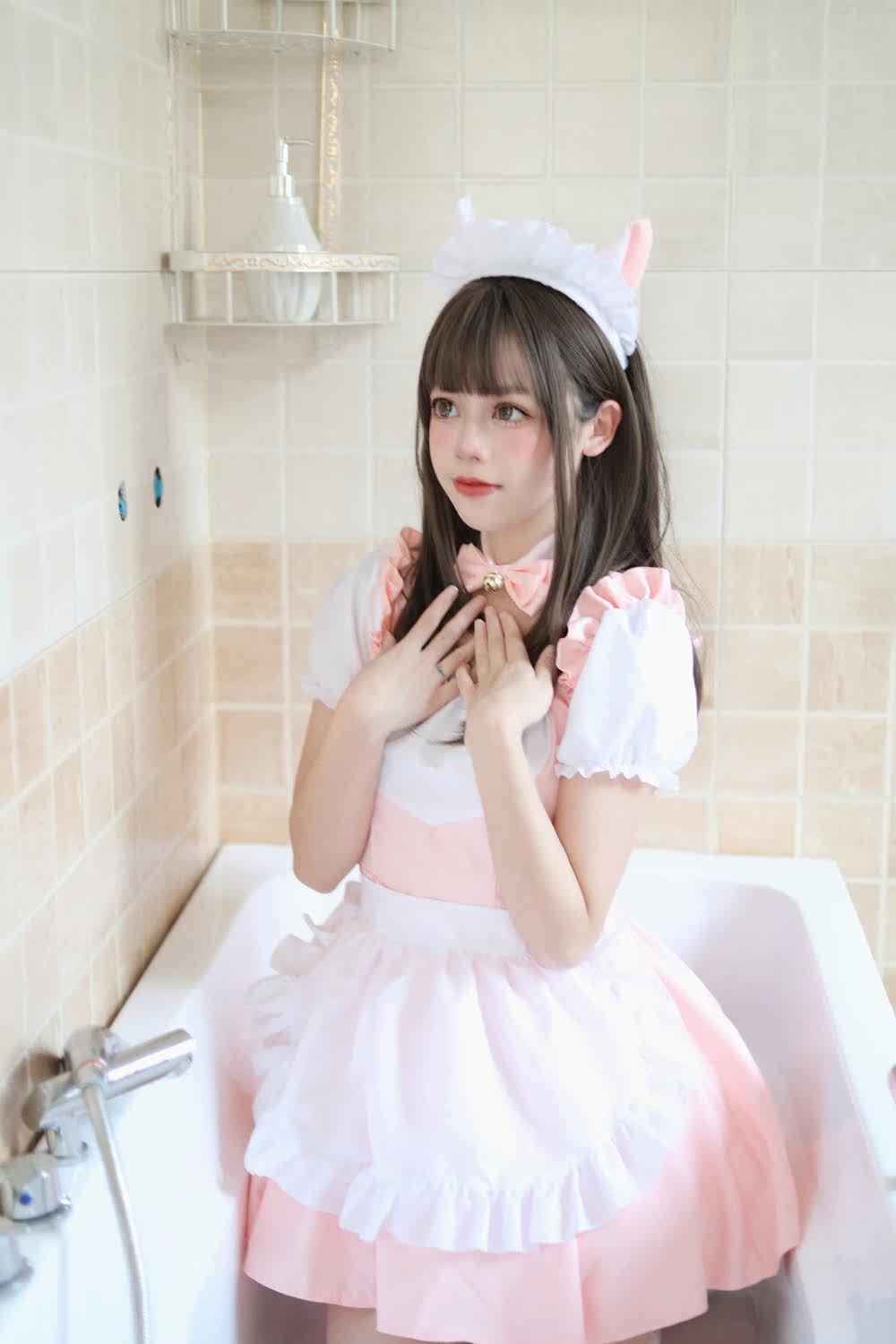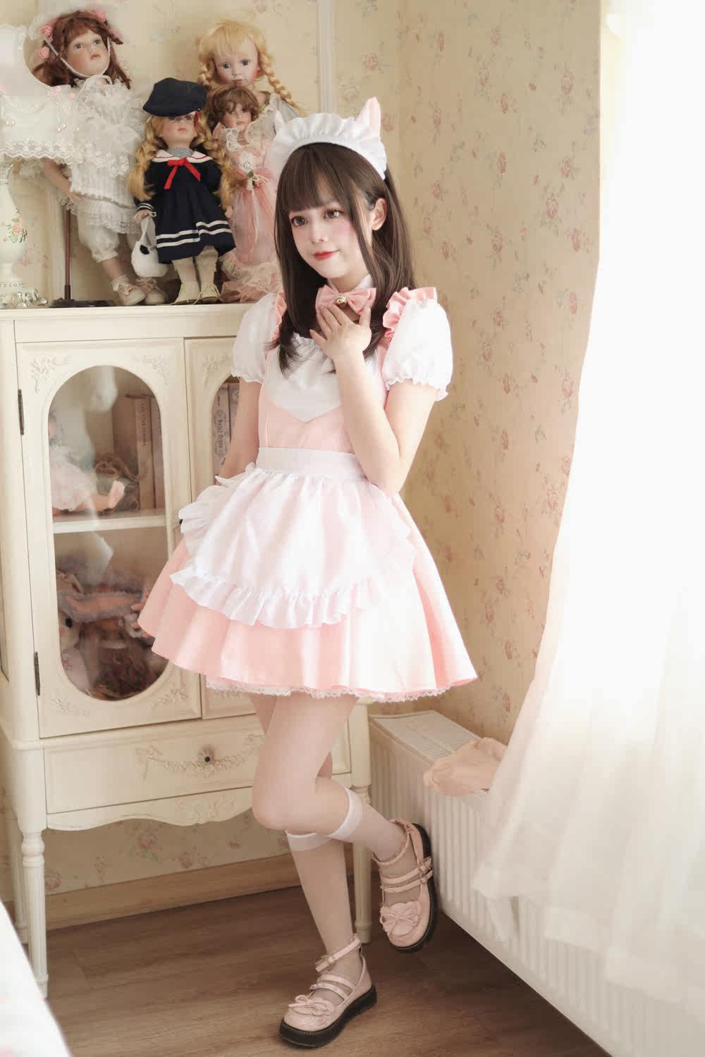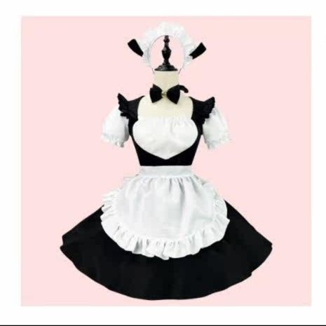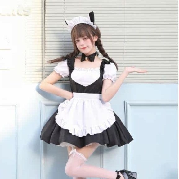 ワンピース、フリルたっぷりのエプロン、リボン付きカチューシャ、首元のチョーカーが全て揃っています。
