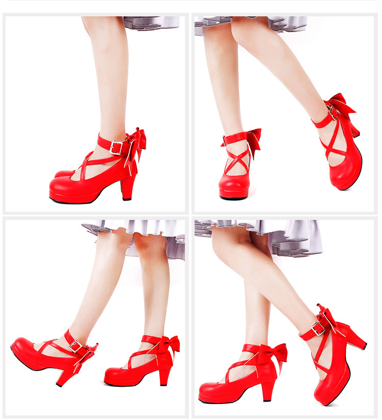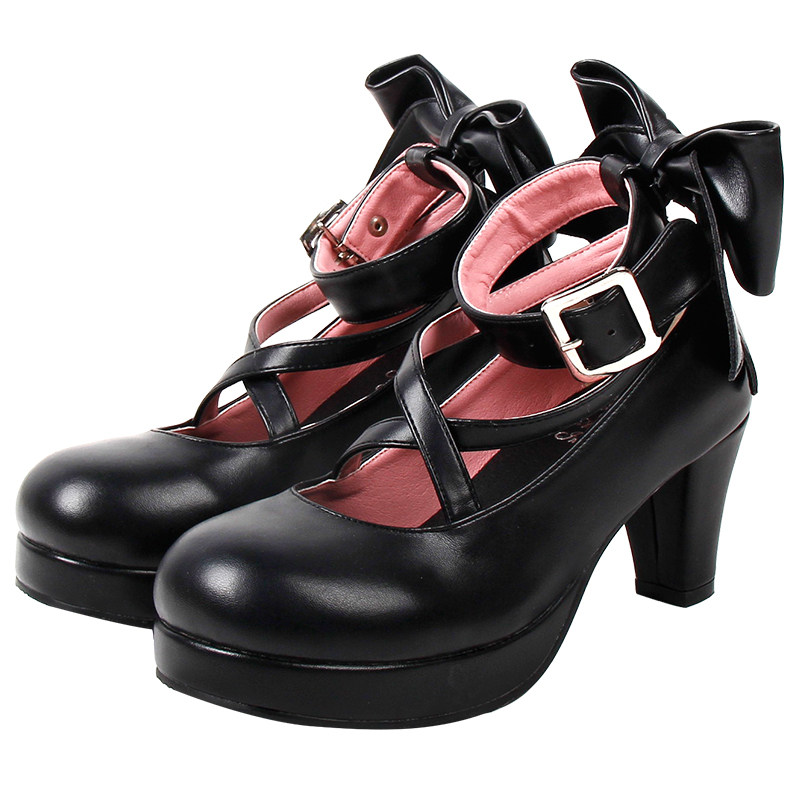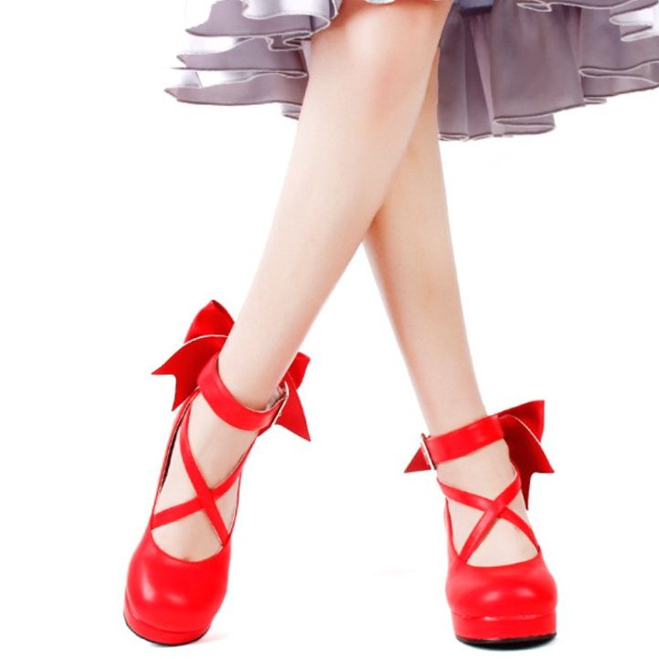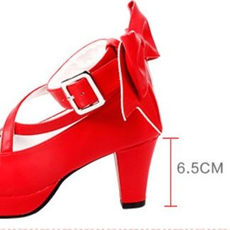 女装メイド衣装にぴったりな、可憐なリボンが際立つ厚底パンプスです。