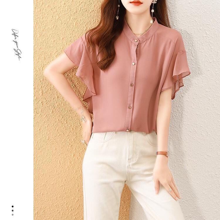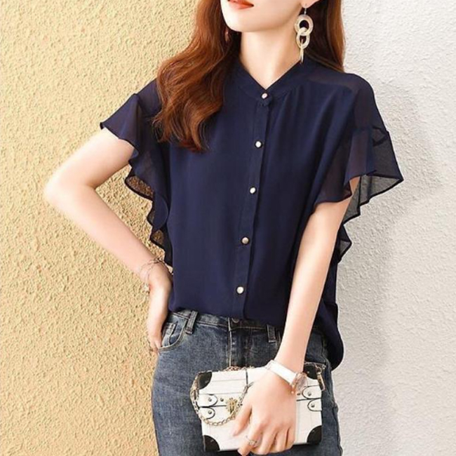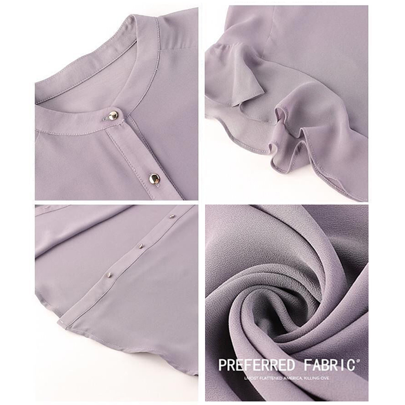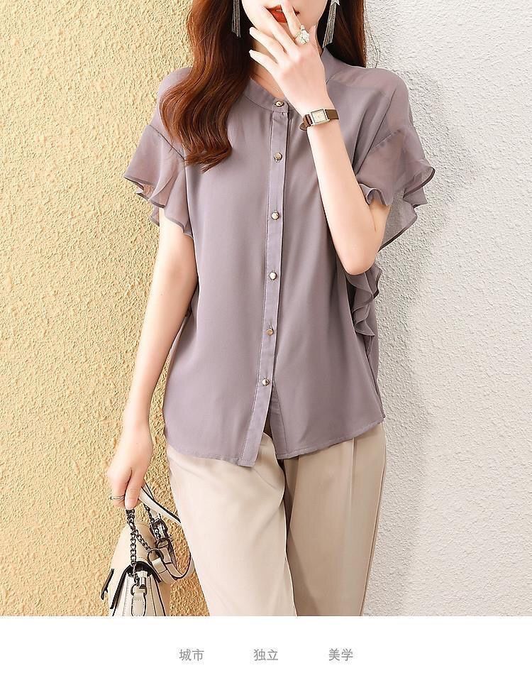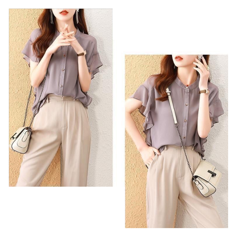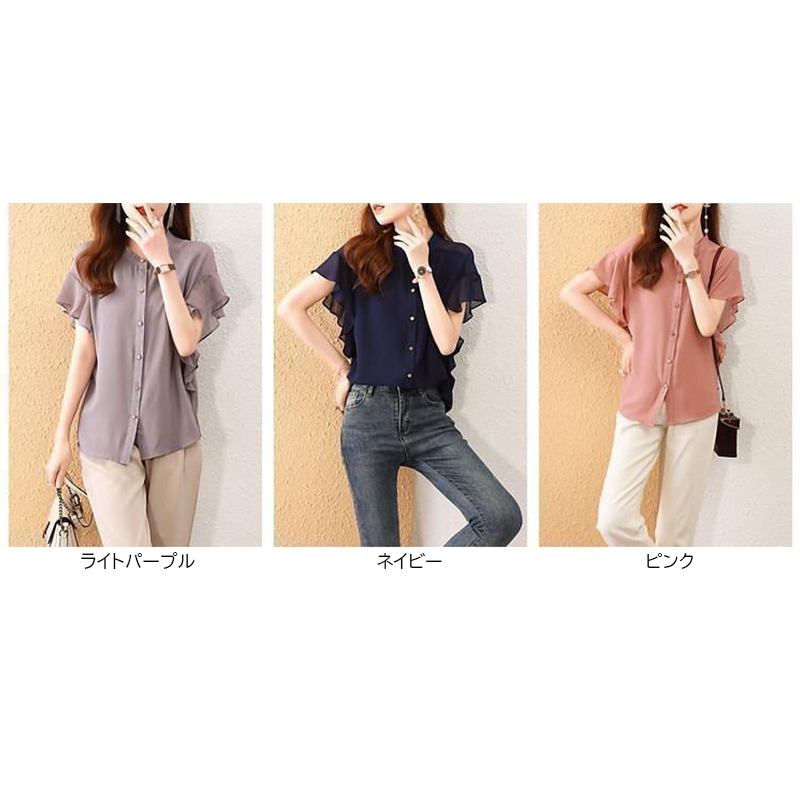 ■コメント ・ふんわりとやわらかなシフォンブラウス。 ・サラッとした快適な着心地。 ・エレガントで上品な女性らしさを醸し出します。 ・フレア袖で軽やかに二の腕カバーが叶います。 ・ボタンを開けてTシャツやタンクトップなどとのレイヤードコーデもスタイリッシュに決まります。 ・オンオフと問わず活躍できるアイテム。