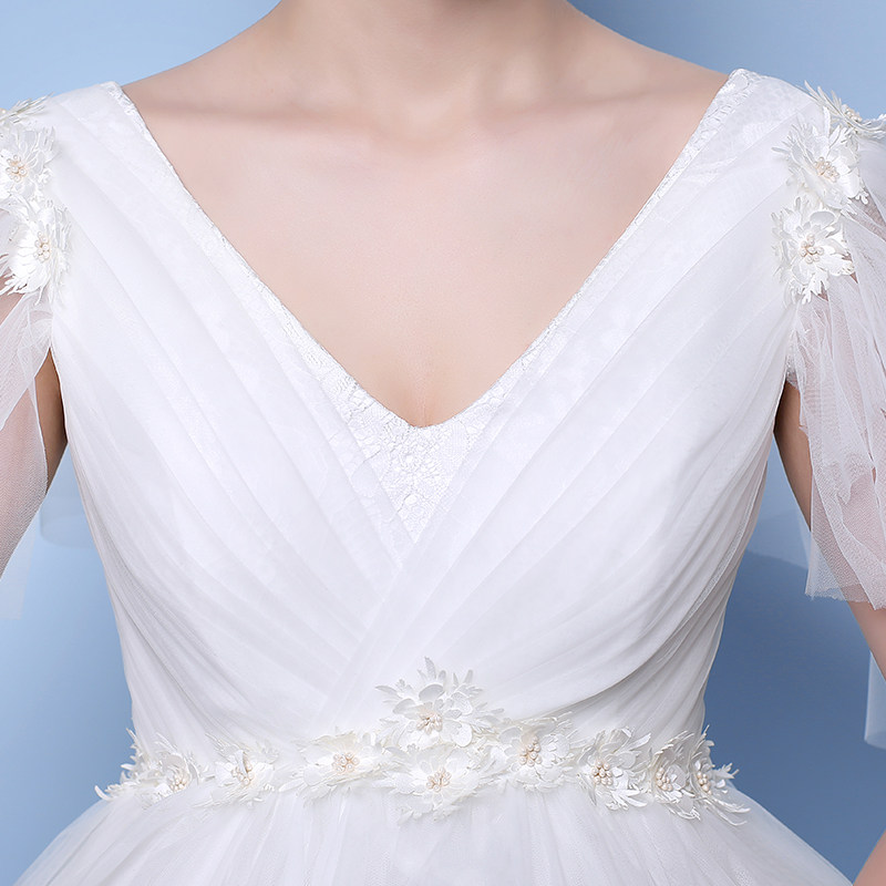 深めのVネックデザインがデコルテを美しく見せ、柔らかなチュール素材の袖が可憐な印象を与えます。