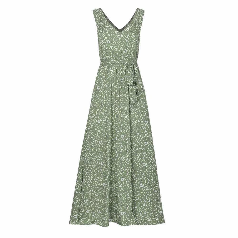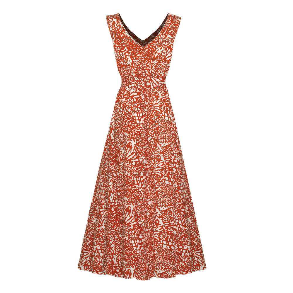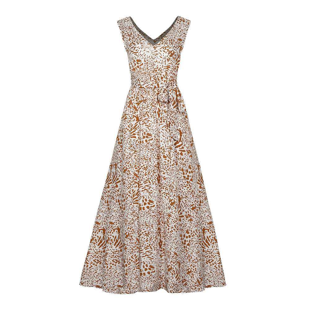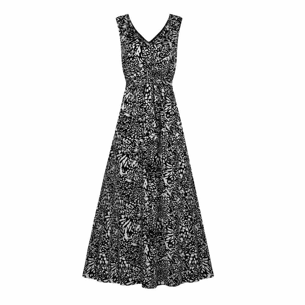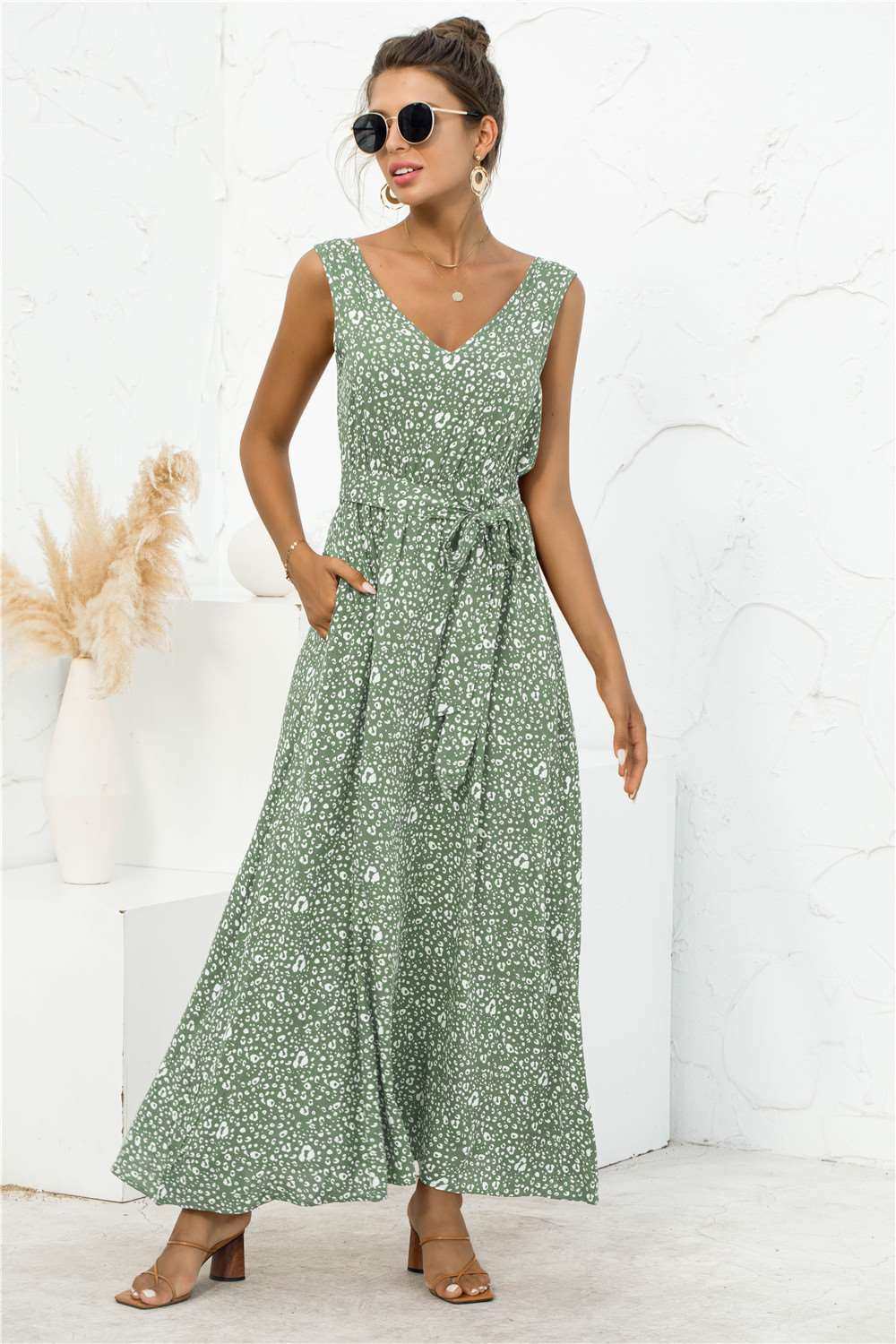 深めのブイネックが美しいデコルテラインを演出し、ノースリーブデザインで涼しげな印象を与えます。