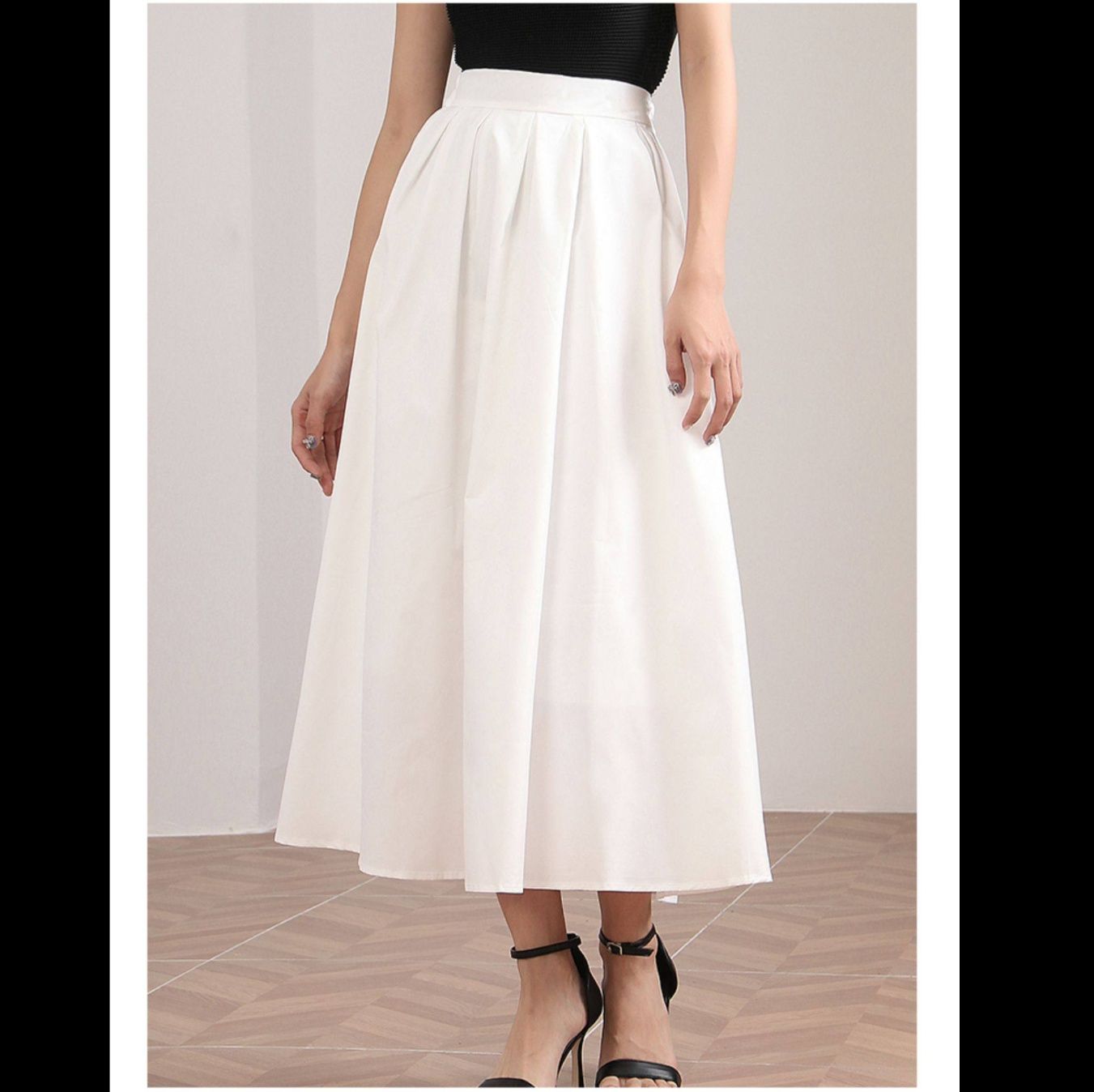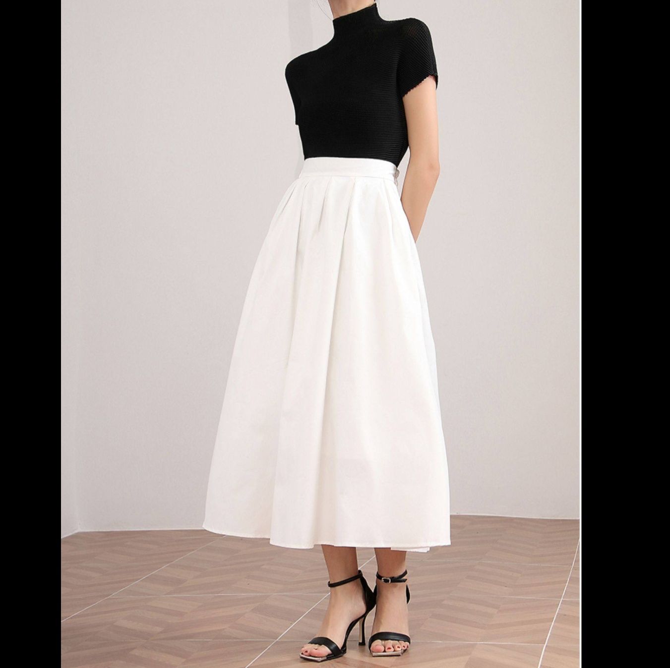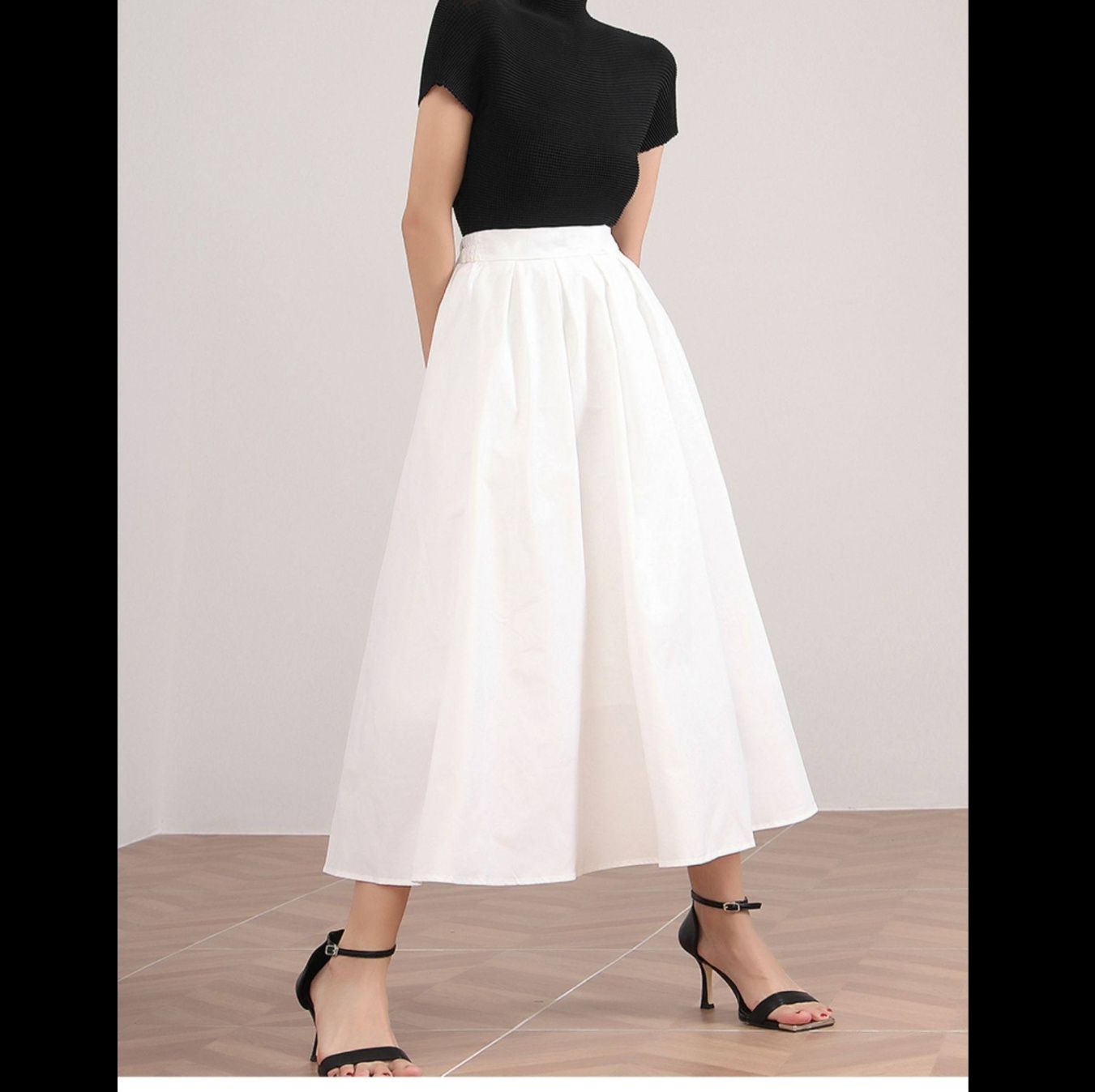 ウエストから広がる美しいタックプリーツが優雅な雰囲気を演出し、ふんわりと揺れる豊かなフレアシルエットが女性らしさを際立たせます。