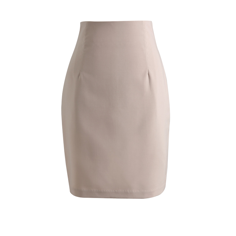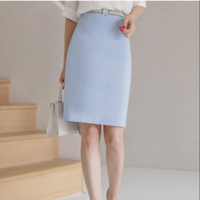 スカートはすっきりとしたシルエットで体のラインを美しく見せ、ベルト付きでウエストマークも可能です。