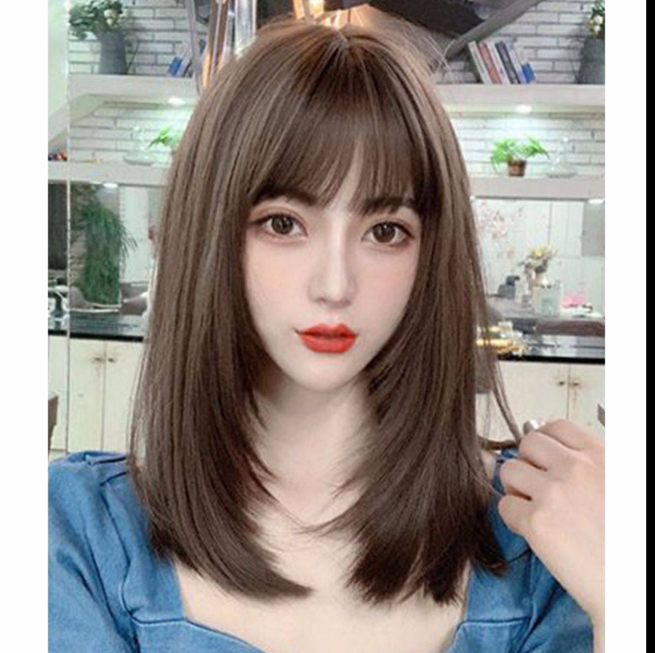 きれいに揃えられた前髪が小顔効果を発揮し、顔周りを優しく包み込むセミロングスタイルが女性らしさを演出します。