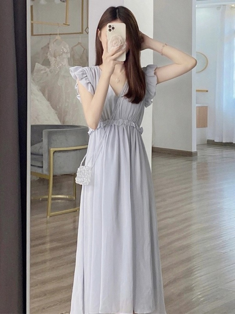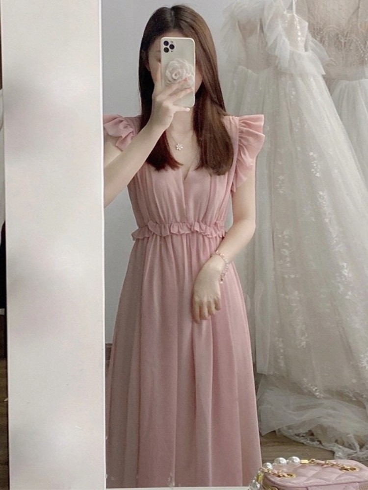 肩のフリル袖が可憐な印象を演出し、ウエストのギャザーデザインが自然なくびれラインを作り出します。