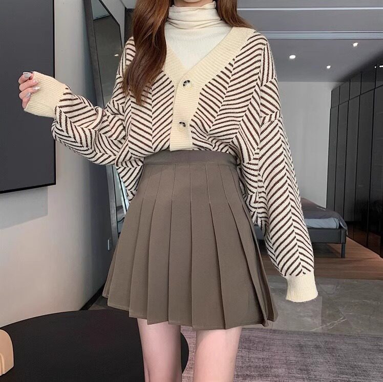 縦に流れるボックスプリーツが美しいシルエットを作り出し、動くたびに揺れる裾が女性らしさを演出します。