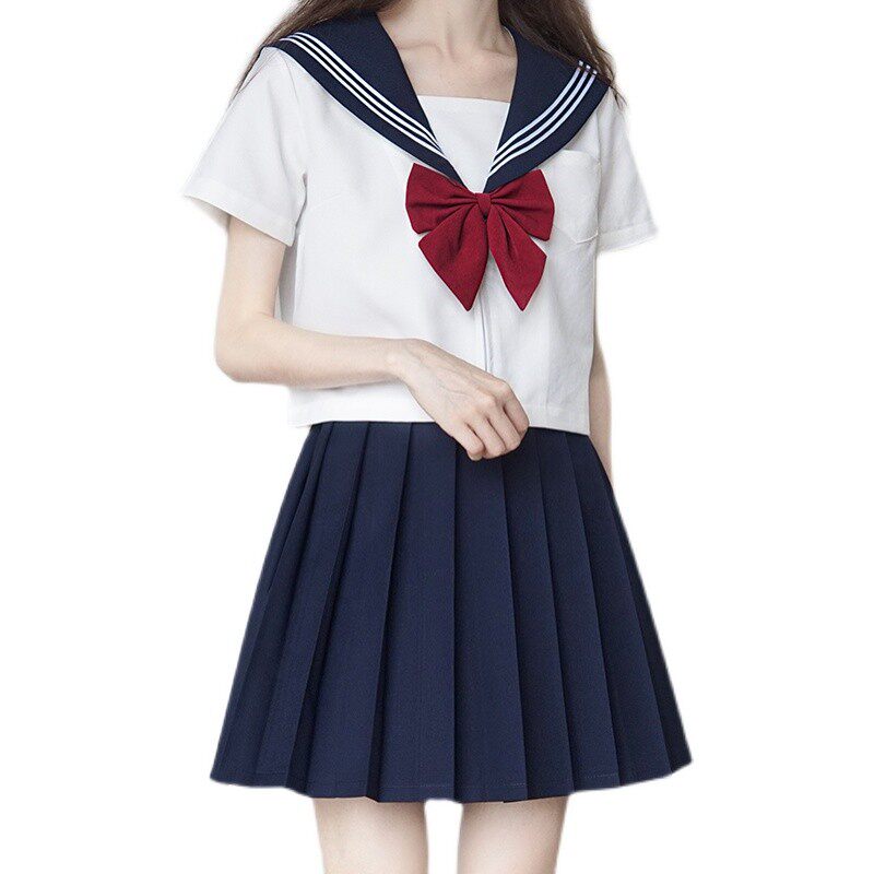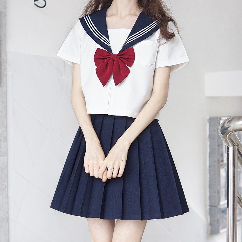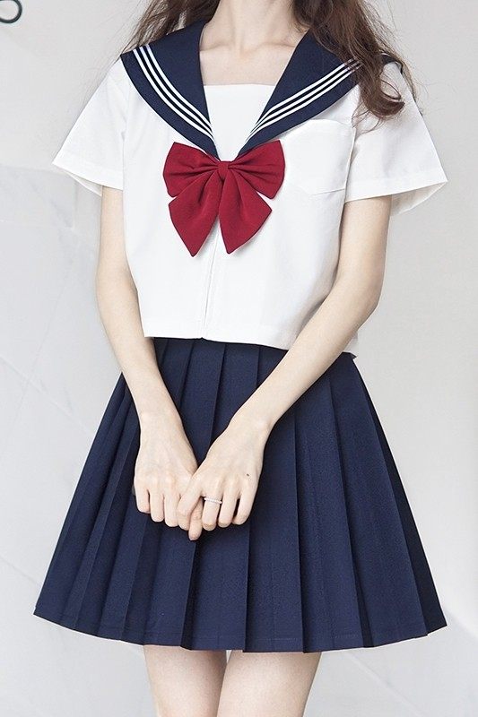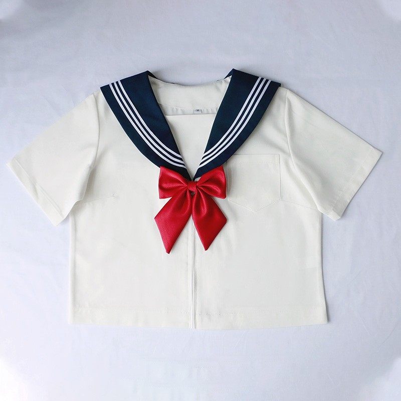 清楚な印象の半袖トップスに襟元の三本線デザインが学生らしさを演出し、胸元の大きなリボンがアクセントになっています。