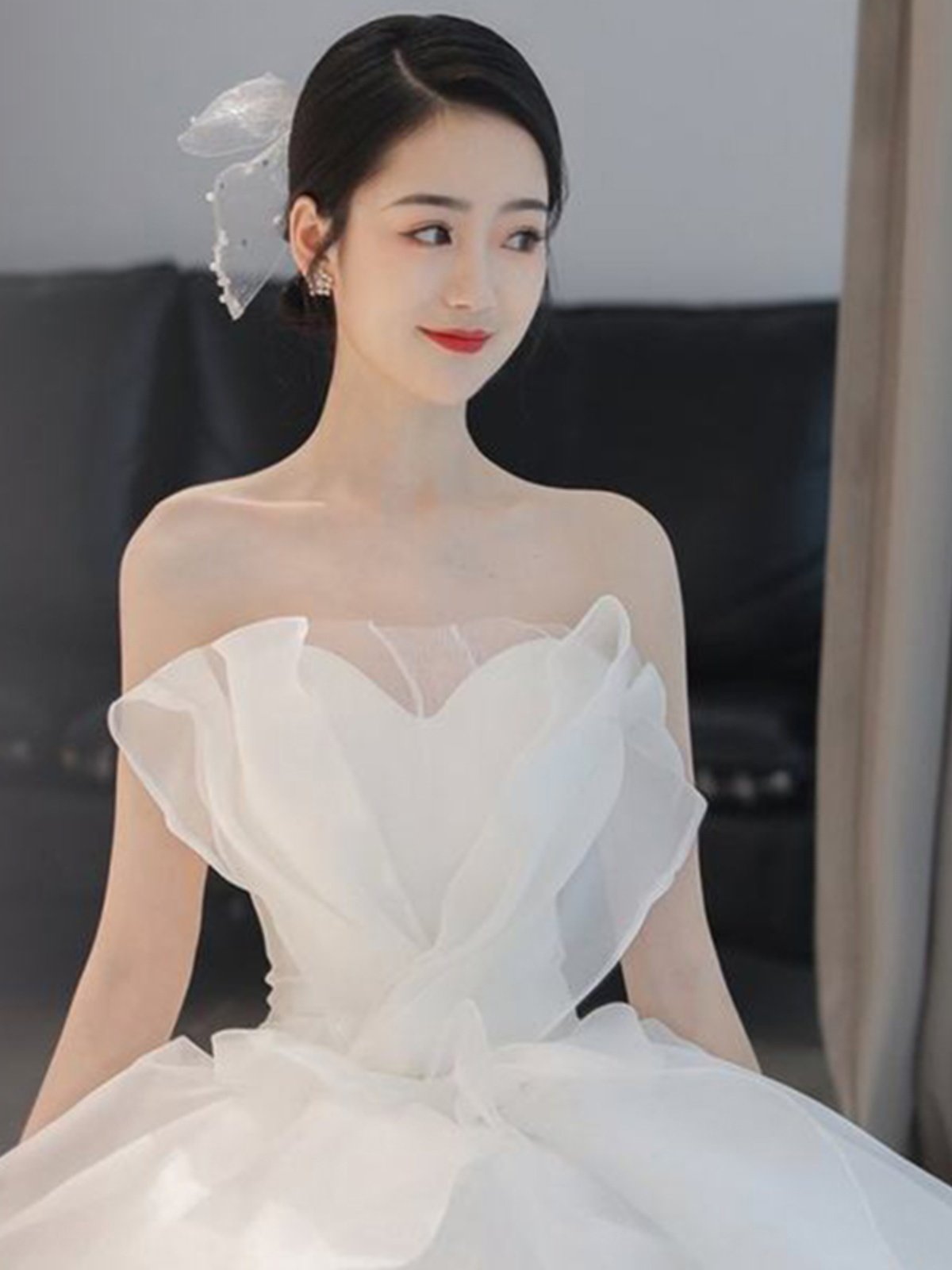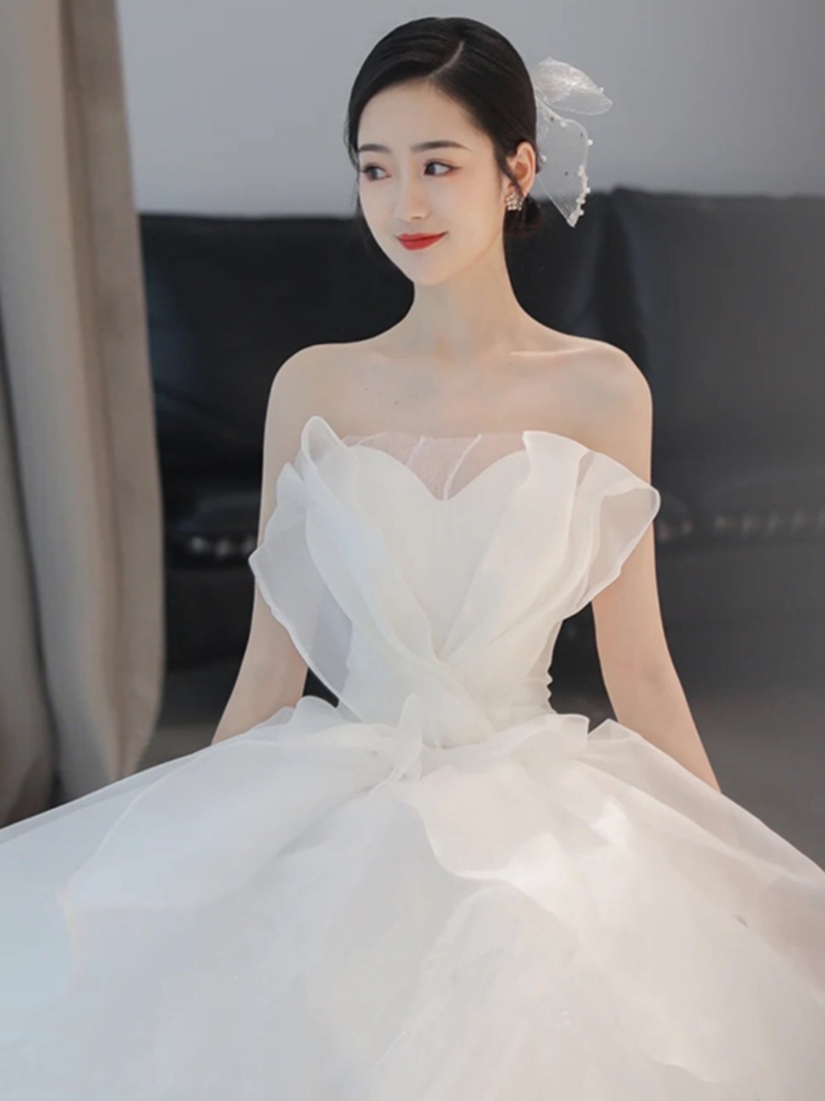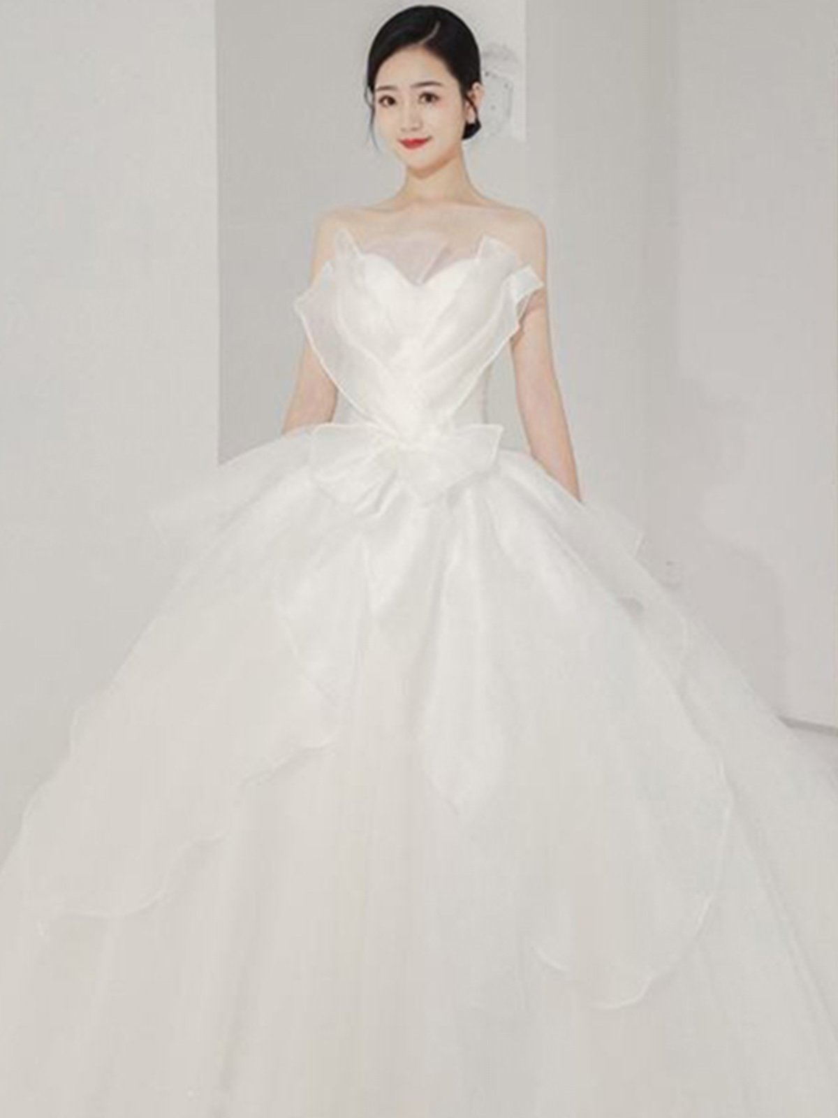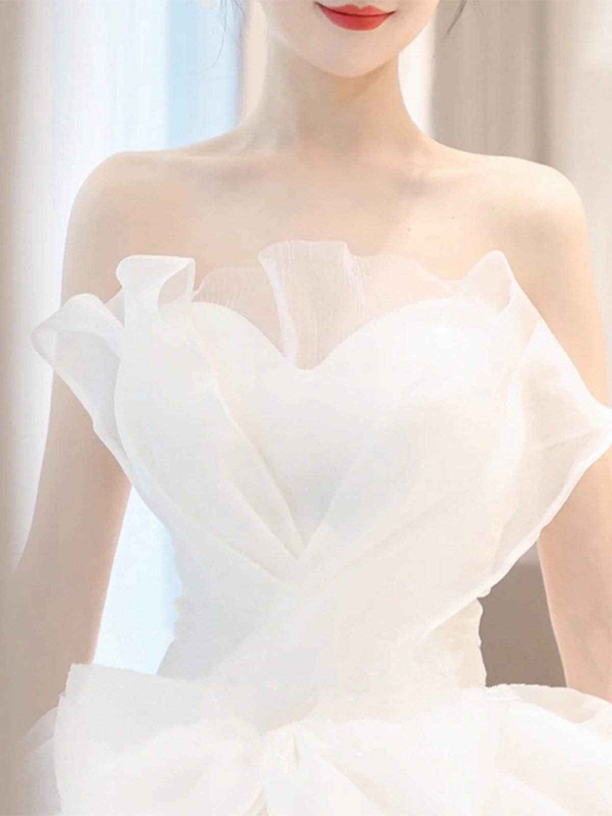 大胆な立体フリルが胸元を美しく飾るオフショルダーデザインで、優雅な印象を演出します。