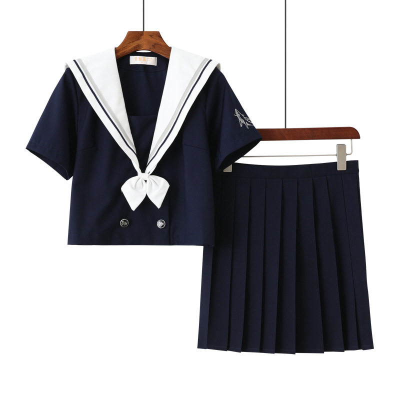 半袖トップスとボックスプリーツスカートの組み合わせで本格的な制服スタイルが完成します。