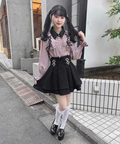 サスペンダー風のデザインが個性的で、フレアシルエットが動くたびに揺れて可愛らしさを引き立てます。