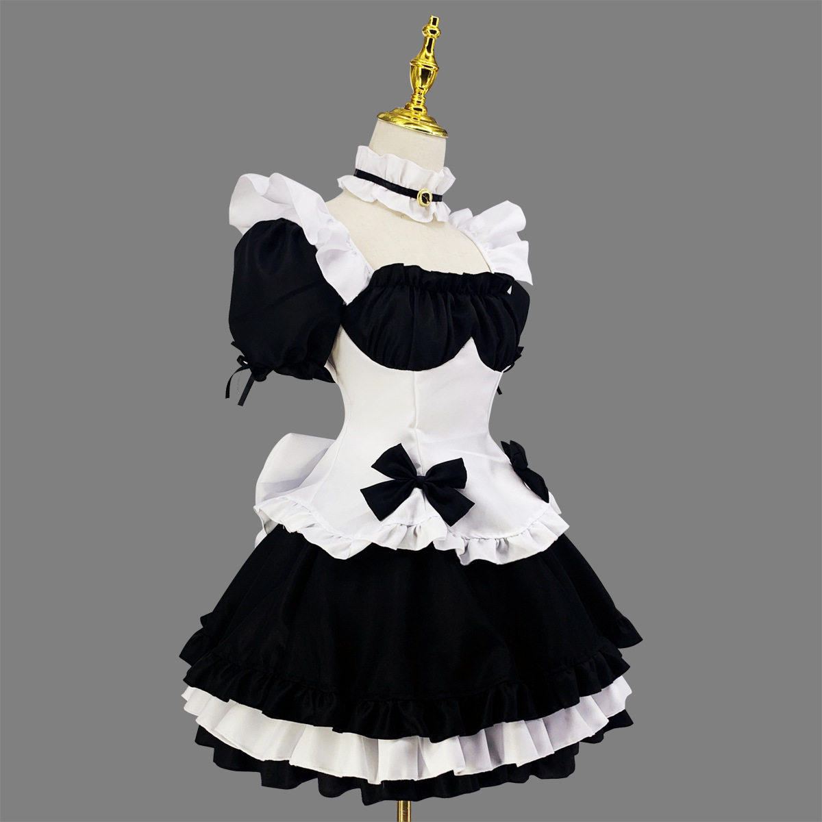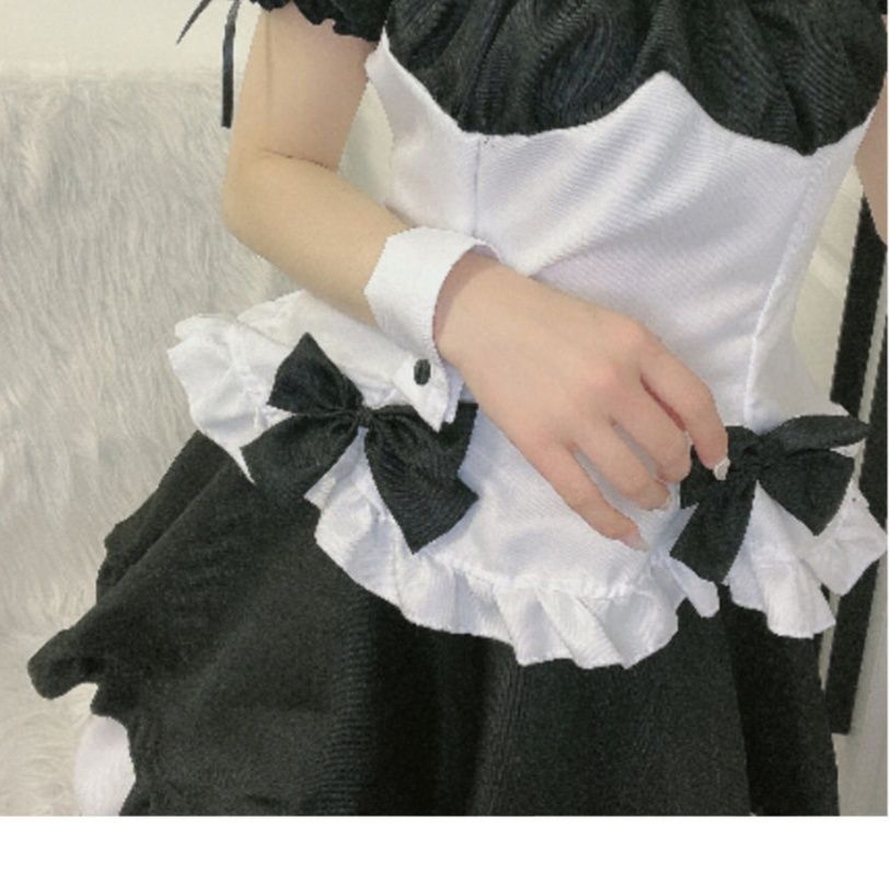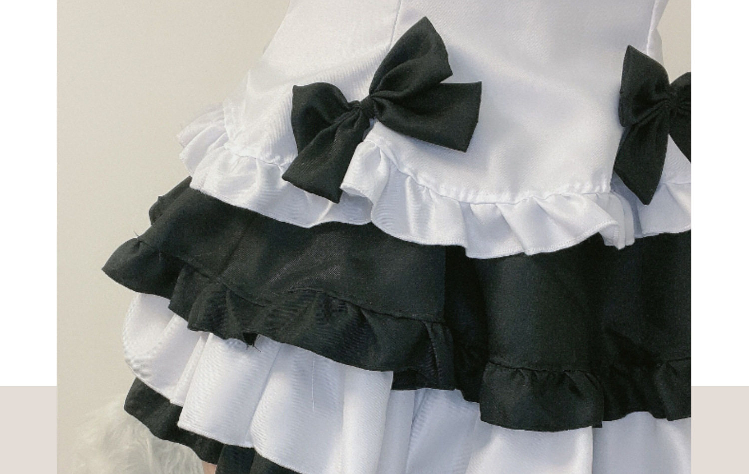ウエストのエプロンには大きなリボンがあしらわれ、首元のチョーカーと袖のリボン結びがアクセントになっています。