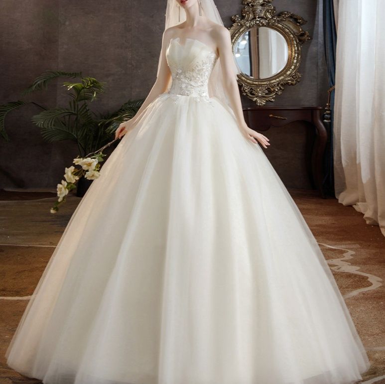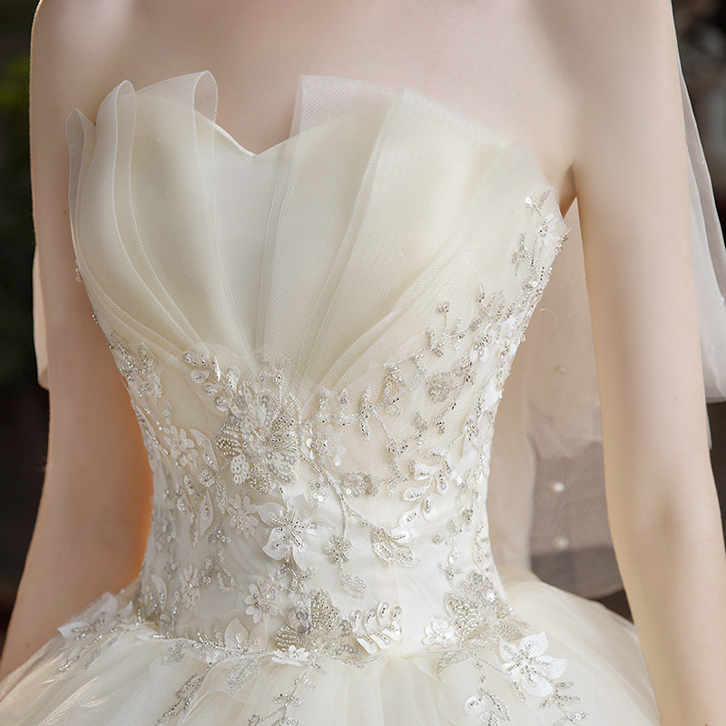 たっぷりとしたチュール素材のスカートがふんわりと広がり、まるでおとぎ話の主人公のようなシルエットを実現。
