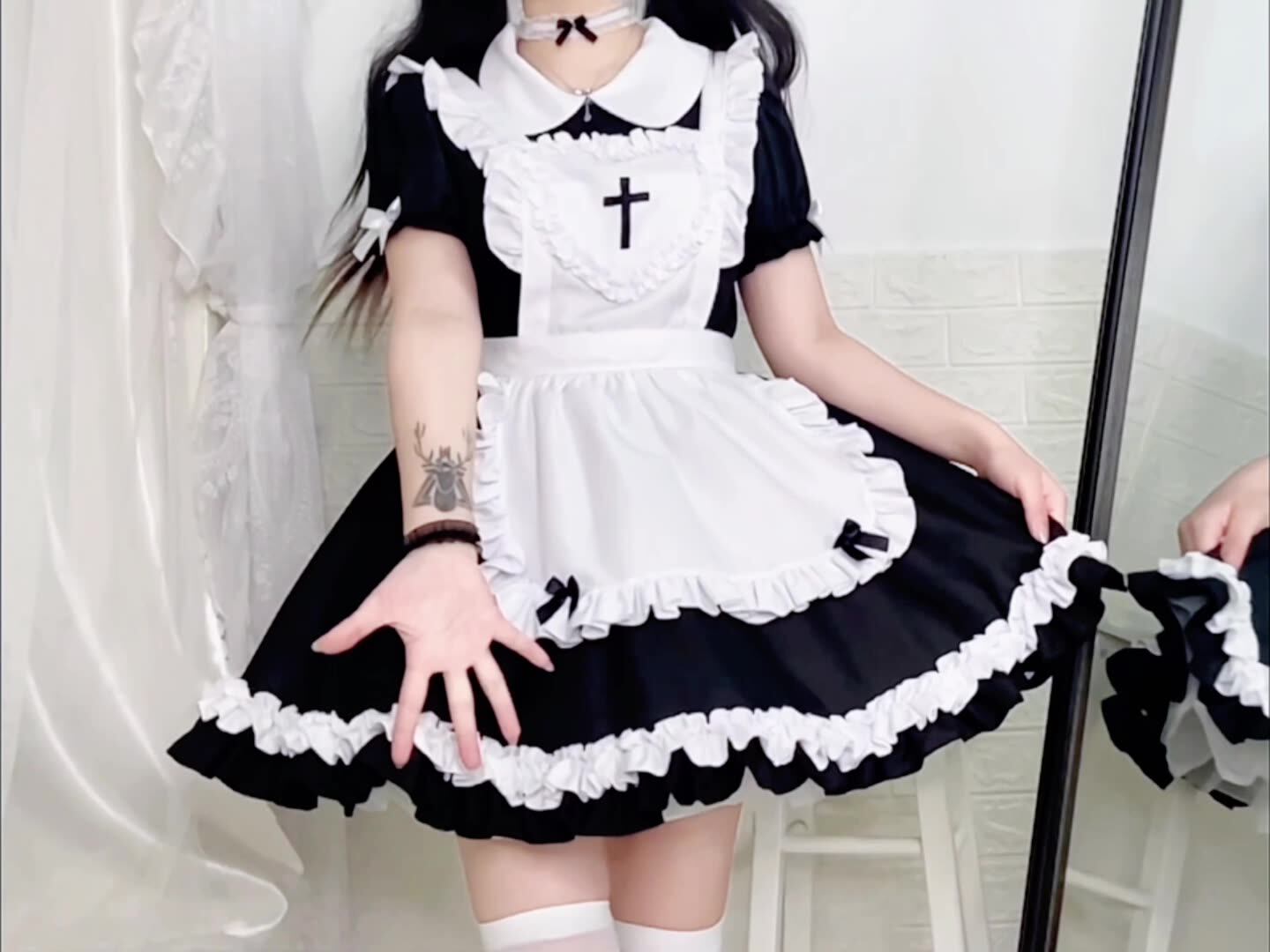 フリル付きの白いエプロンが全体のアクセントとなり、清潔感と可憐な雰囲気を引き立てます。