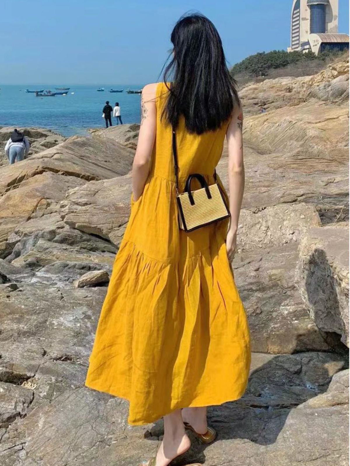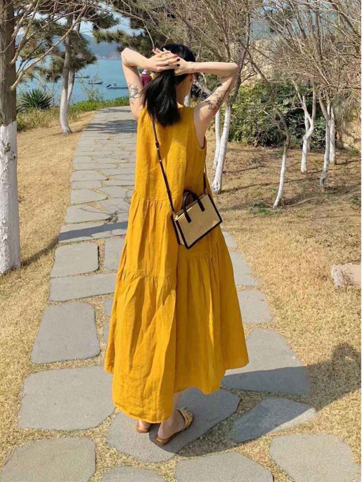 襟なしのすっきりとしたネックラインとノースリーブ仕様で、夏の装いにぴったりの一枚になっています。