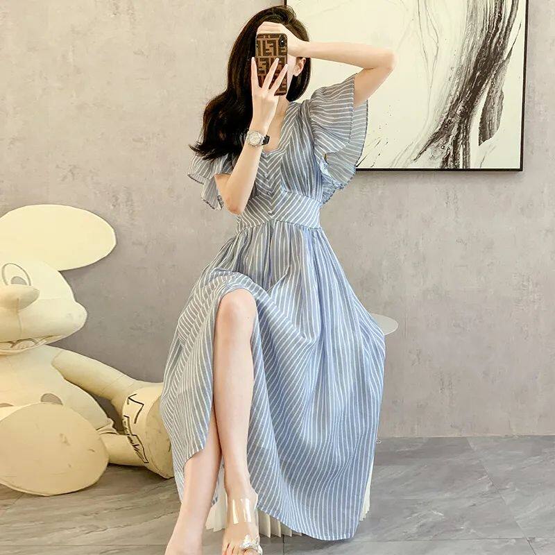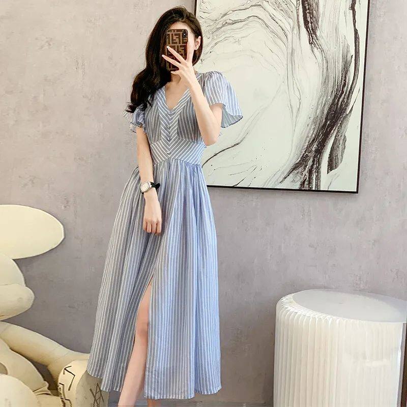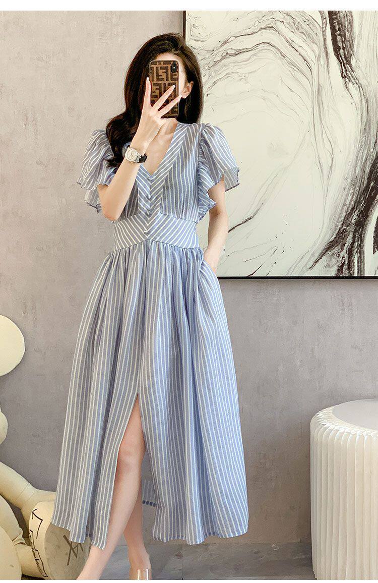 フロントスリット入りで歩きやすく、夏のお出かけやデートシーンにぴったりの一着です。