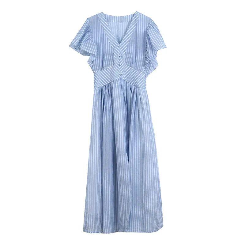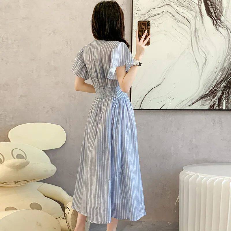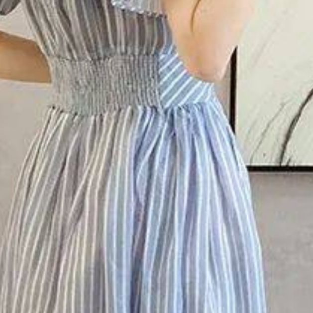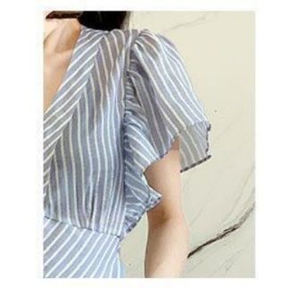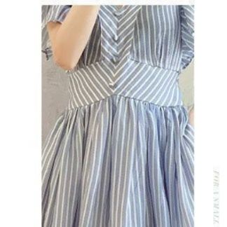 爽やかな縦縞柄が特徴的なこのワンピースは、女装初心者の方にもおすすめの上品なデザインです。