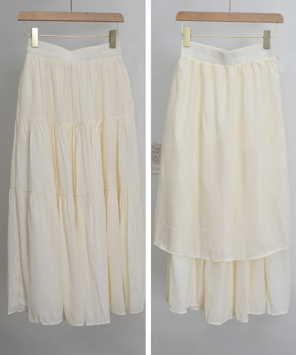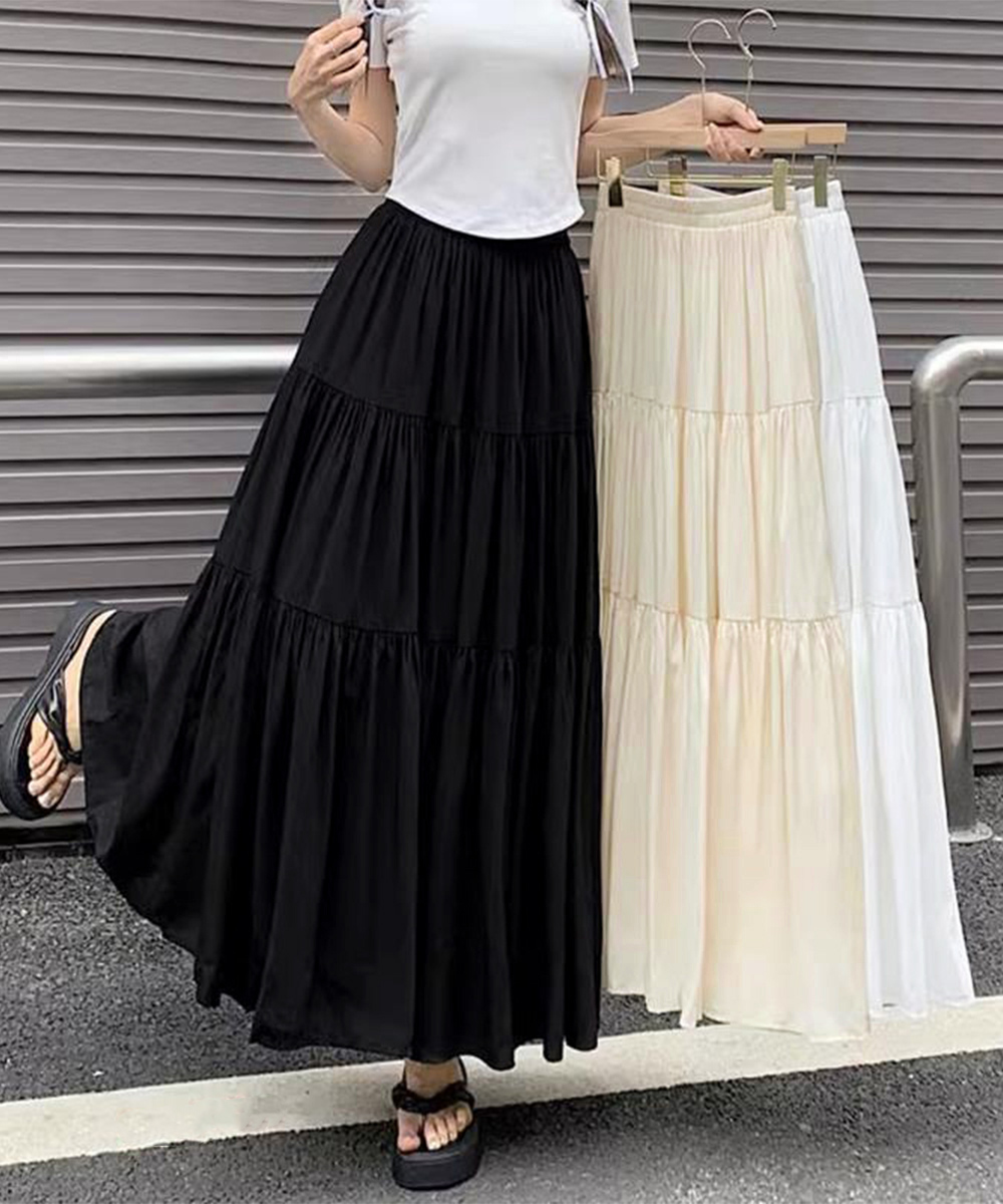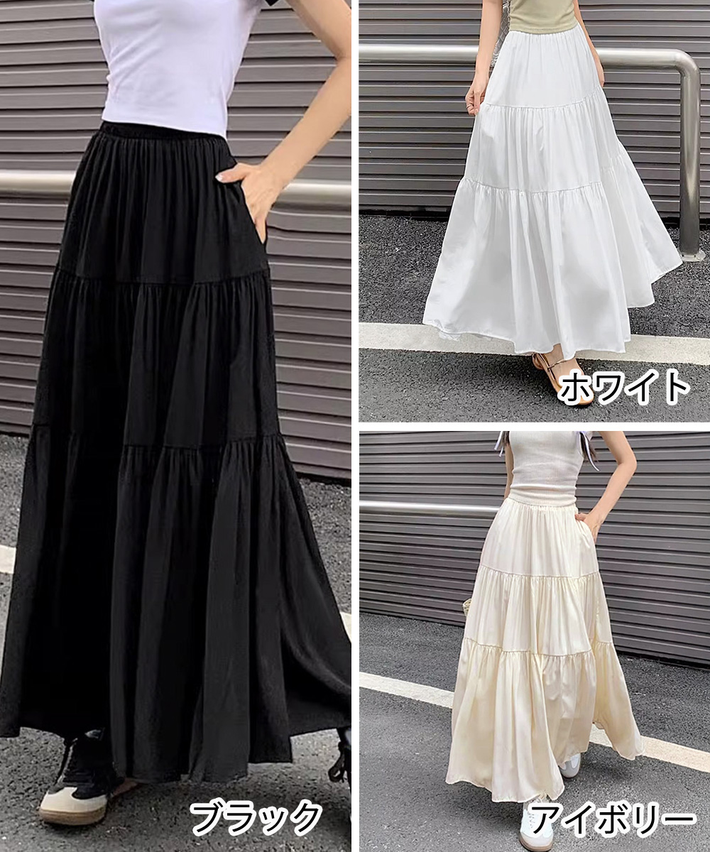 軽やかな生地感と美しい段々フリルが特徴的なティアードロングスカート。