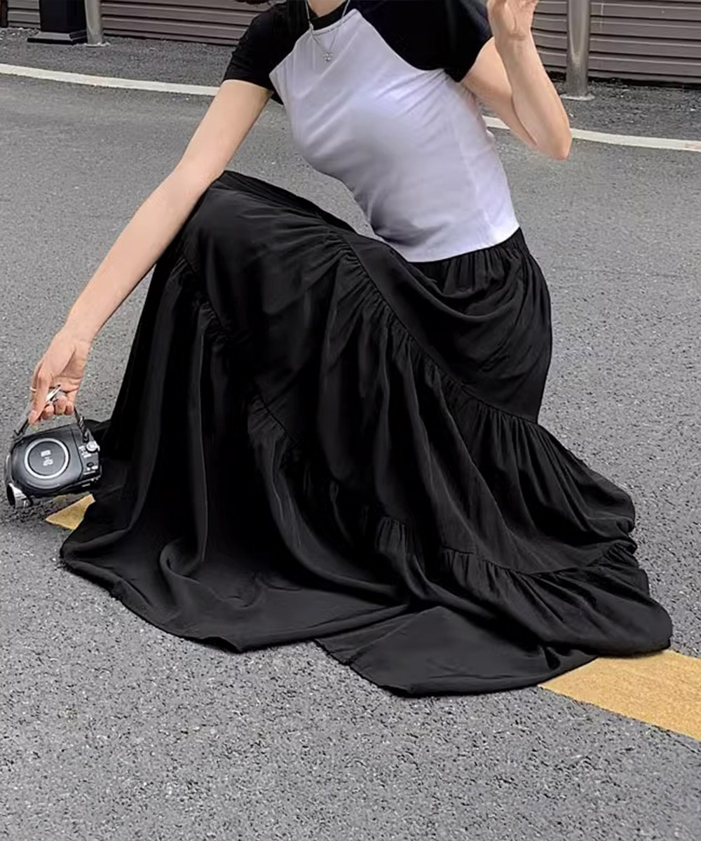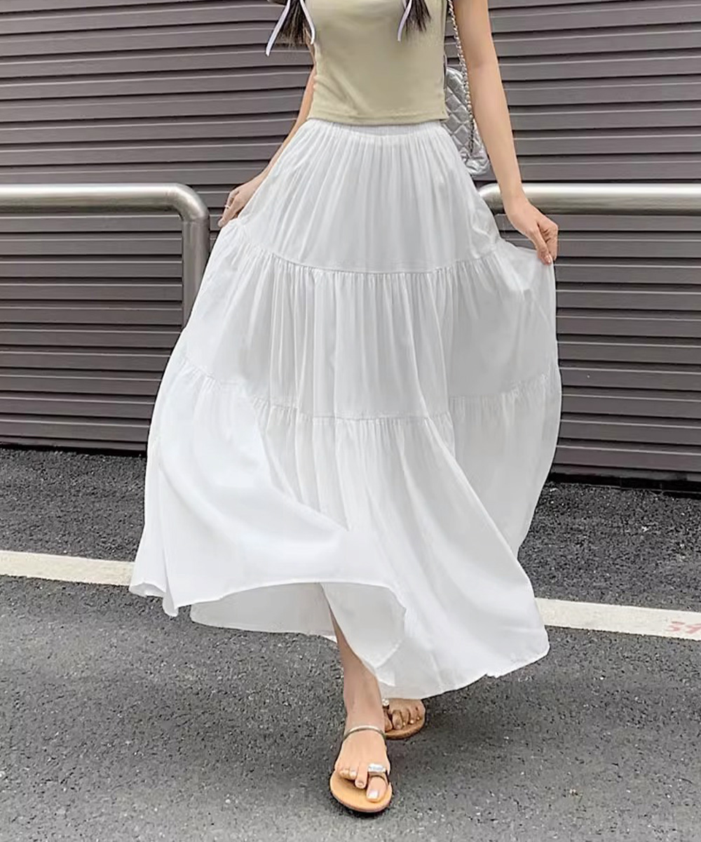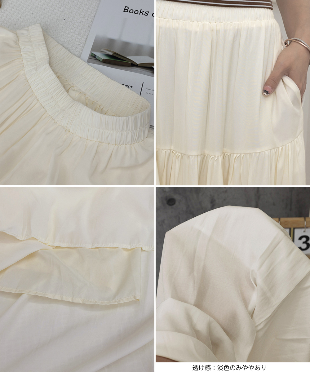 軽やかな生地感と美しい段々フリルが特徴的なティアードロングスカート。