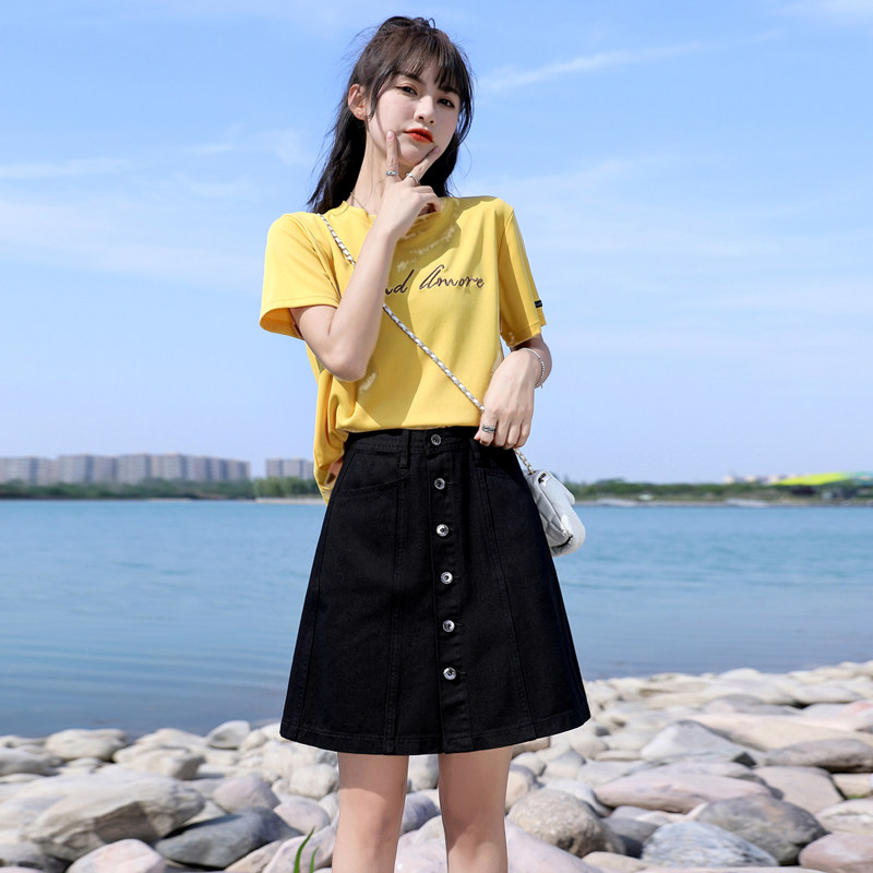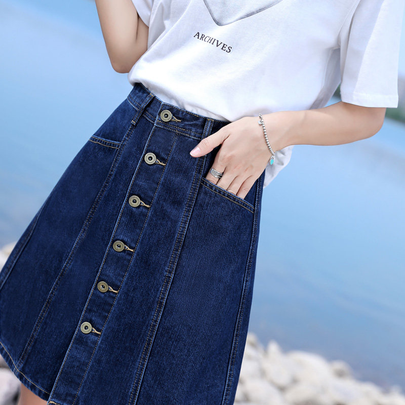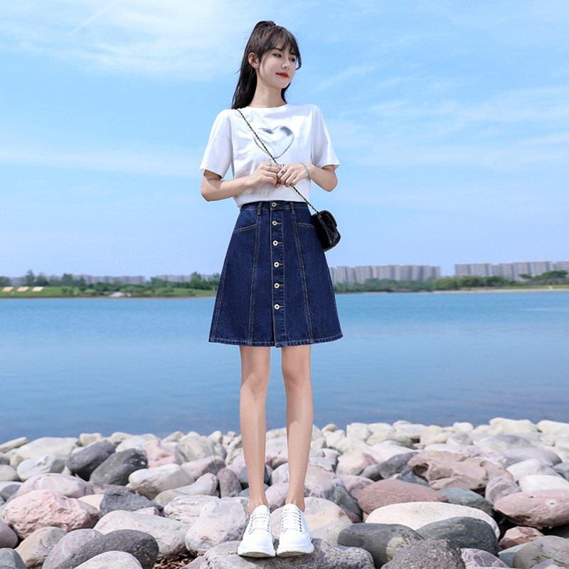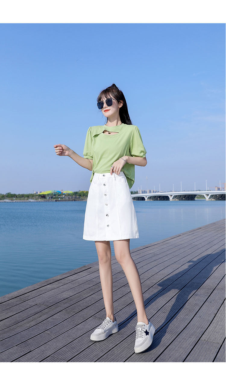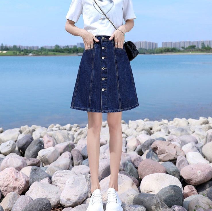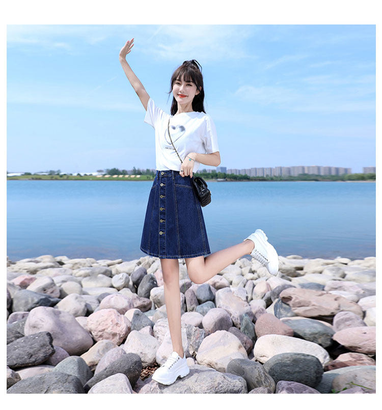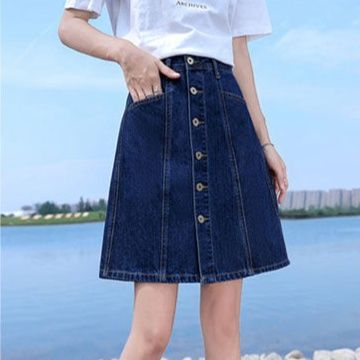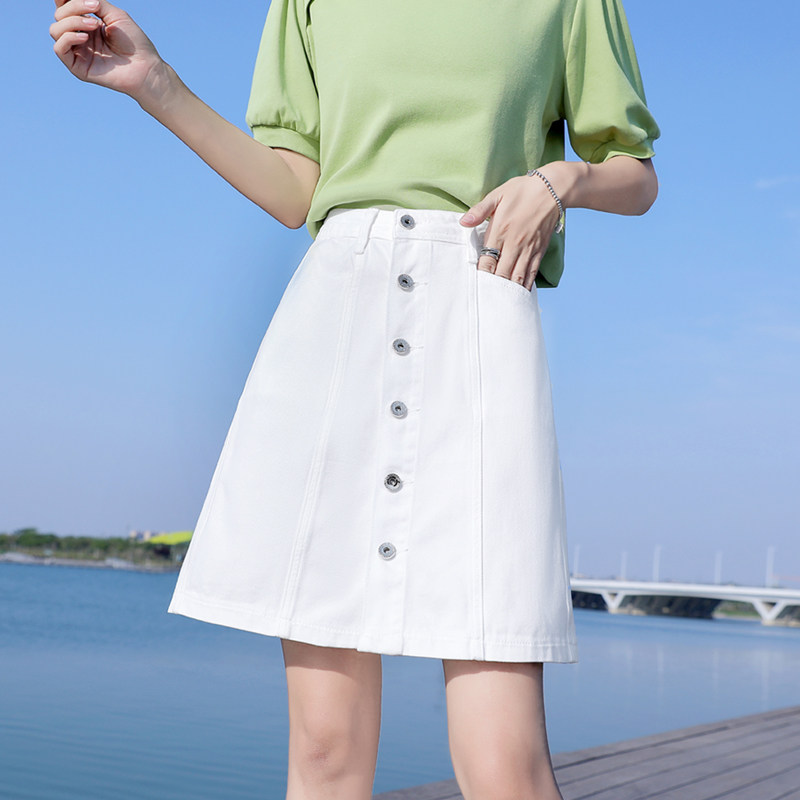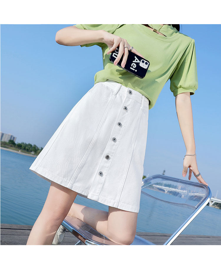 フロントに並んだボタンがアクセントとなり、台形シルエットが脚のラインを美しく見せてくれます。
