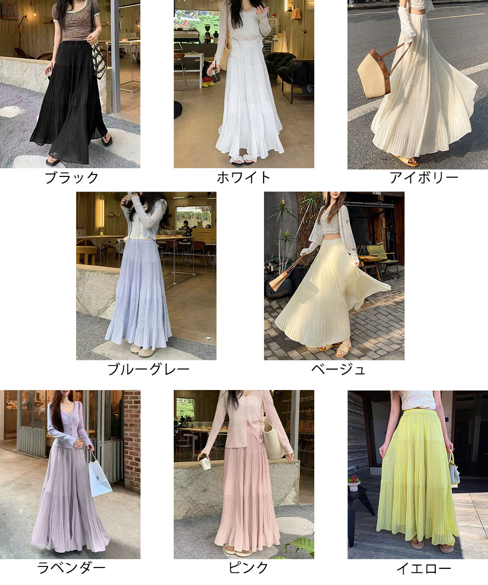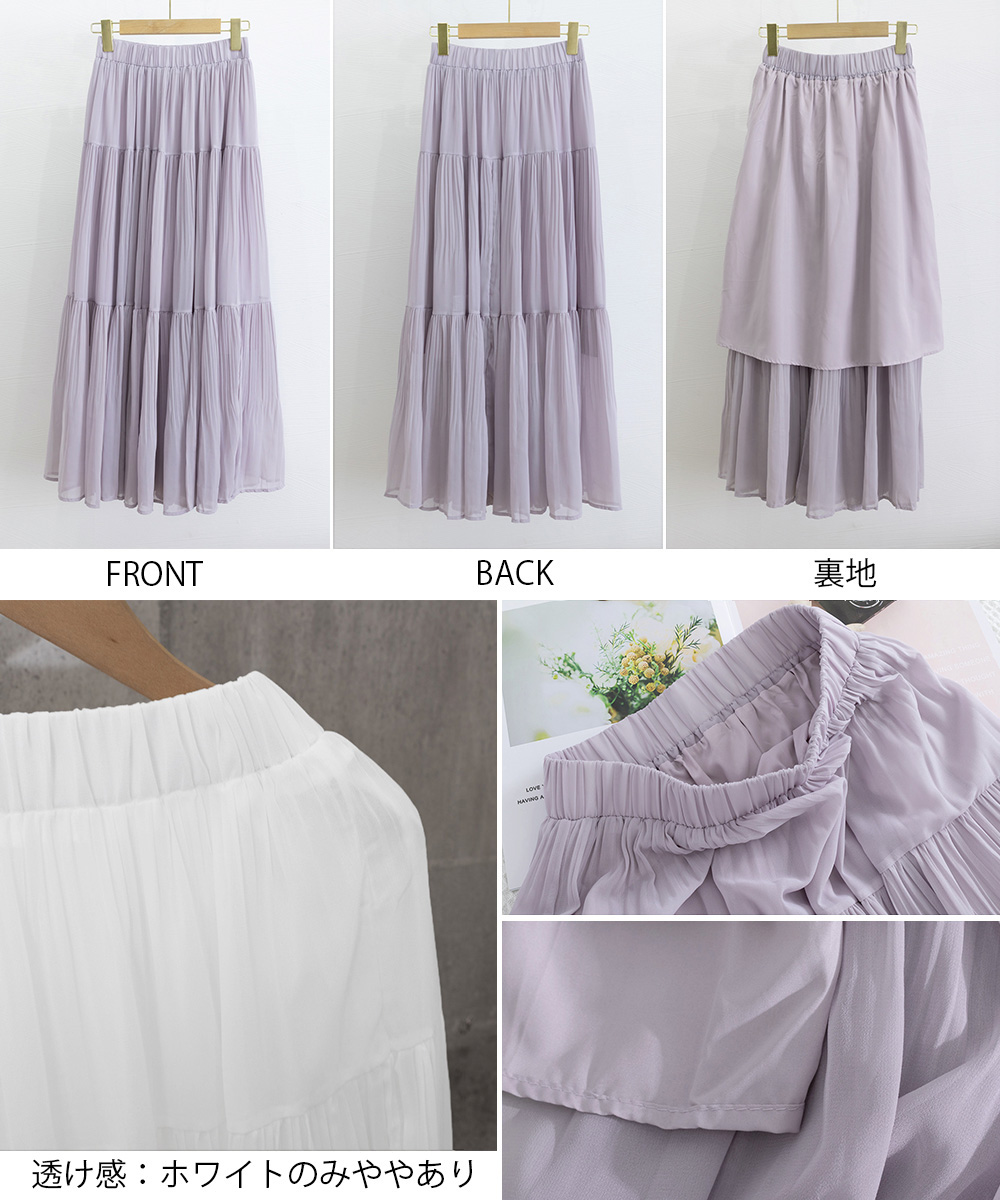 表地素材:ポリエステル100% 裏地素材:ポリエステル100% カラー:ブラック/ホワイト/アイボリー/ブルーグレー/ベージュ/ラベンダー/ピンク/イエロー サイズ:ワンサイズ スカート丈:約90cm 裏地丈:約57cm ウエスト(ゴム仕様):約58-108cm ヒップ:約126cm 裏地:あり 伸縮性:なし 透け感:ホワイトのみややあり