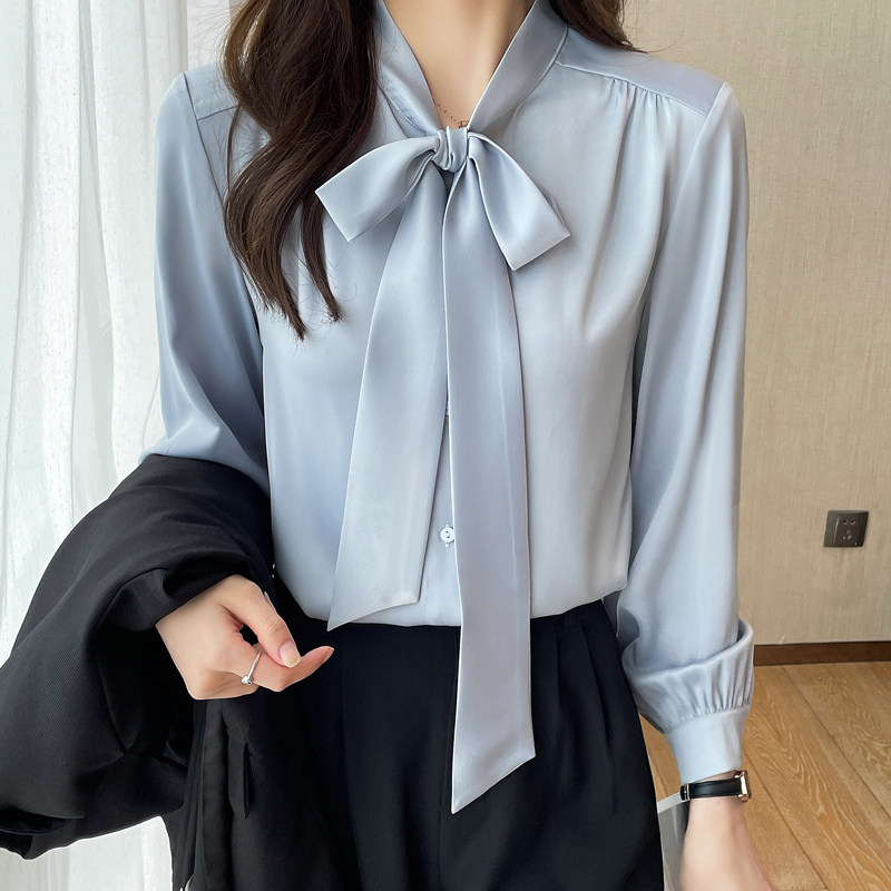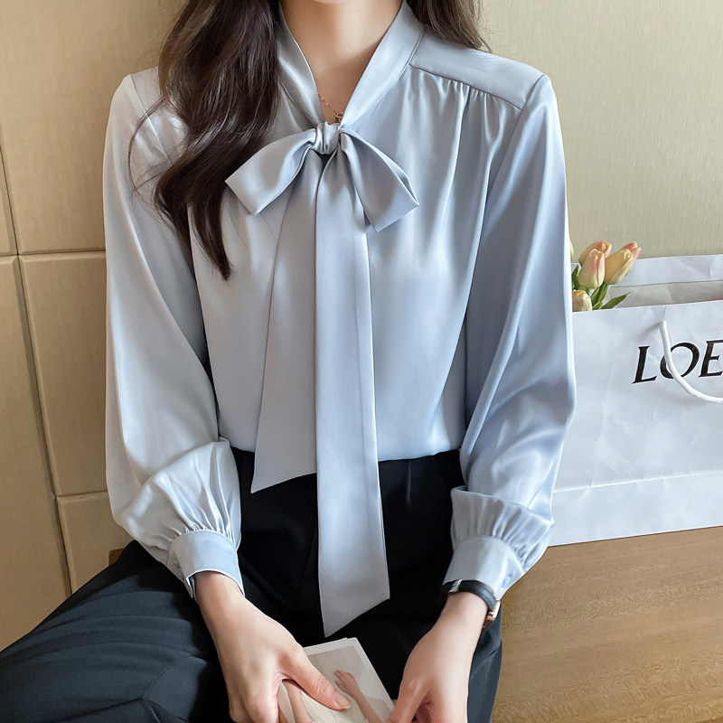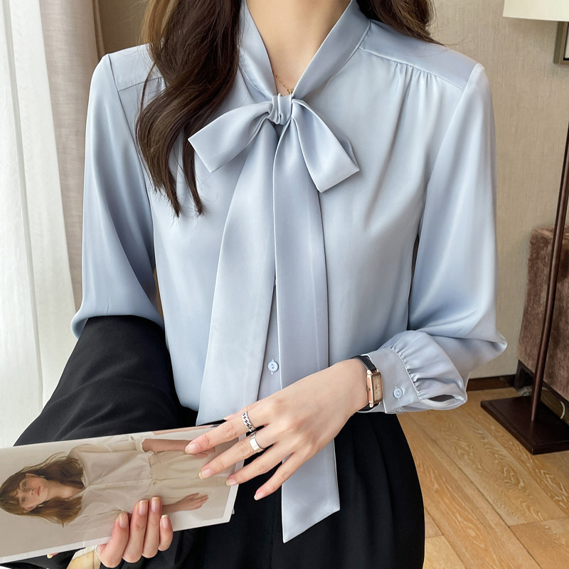 女装スタイルを上品に演出する光沢素材の長袖ブラウスです。