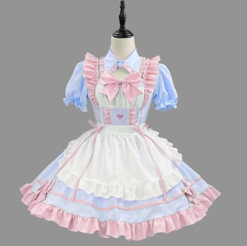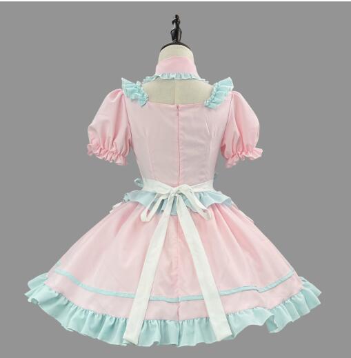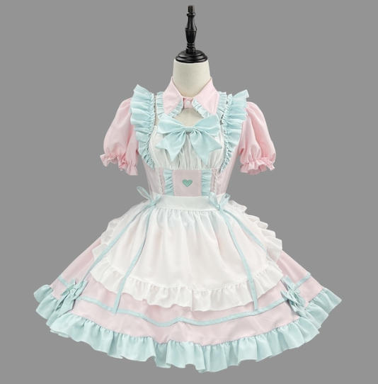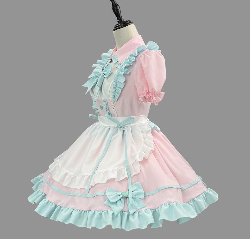 桃色と水色の優しい配色に、たっぷりのフリルとリボンが施された華やかなデザイン。
